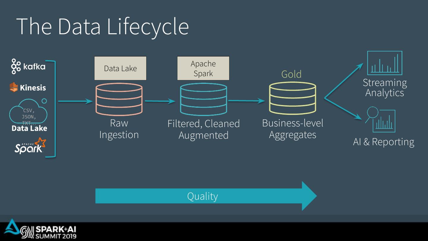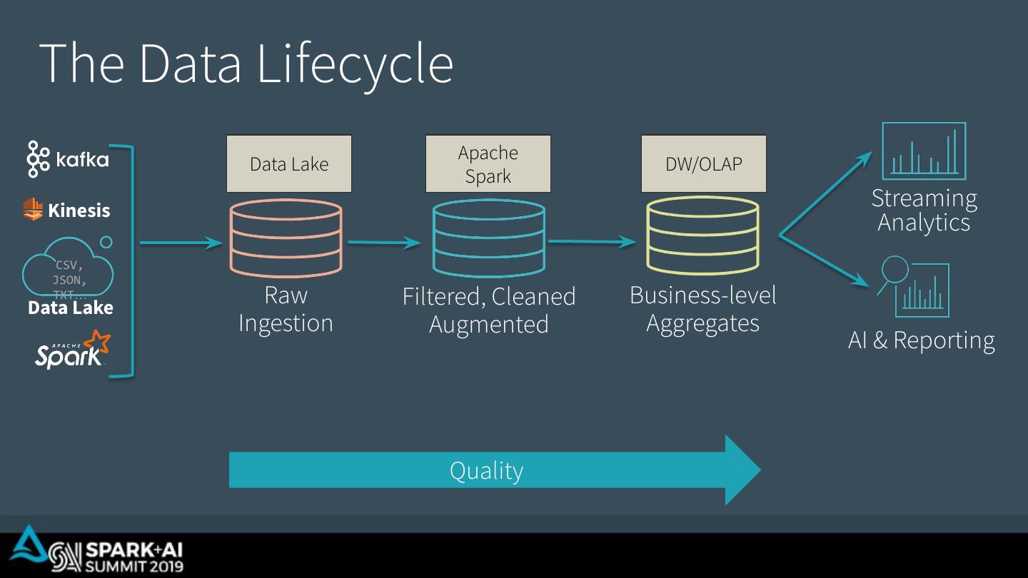 18 . The Data Lifecycle Apache Data Lake DW/OLAP Bronze Silver Spark Gold Kinesis Streaming Analytics CSV, JSON, TXT… Data Lake Raw Filtered, Cleaned Business-level Ingestion Augmented Aggregates AI & Reporting Quality