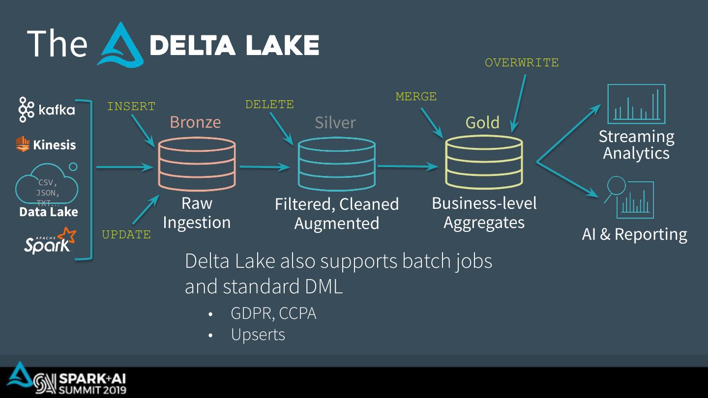 25 . The OVERWRITE MERGE INSERT DELETE Bronze Silver Gold Kinesis Streaming Analytics CSV, JSON, TXT… Data Lake Raw Filtered, Cleaned Business-level Ingestion Augmented Aggregates UPDATE AI & Reporting Delta Lake also supports batch jobs and standard DML • GDPR, CCPA • Upserts