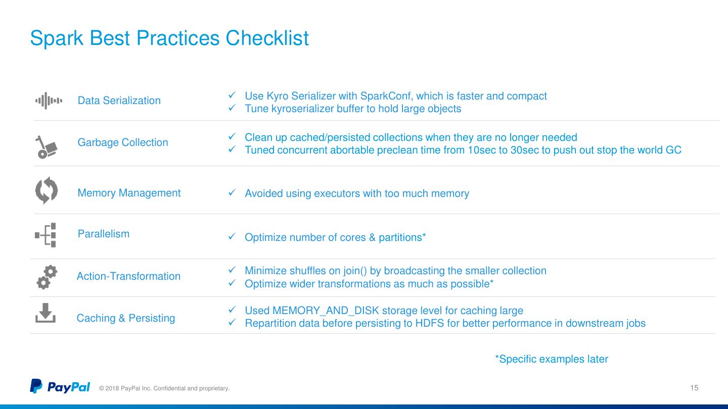 15 .Design Spark Best Practices Checklist Considerations for Spark Data Serialization Use Kyro Serializer with SparkConf, which is faster and compact Tune kyroserializer buffer to hold large objects Garbage Collection Clean up cached/persisted collections when they are no longer needed Tuned concurrent abortable preclean time from 10sec to 30sec to push out stop the world GC Memory Management Avoided using executors with too much memory Parallelism Optimize number of cores & partitions* Action-Transformation Minimize shuffles on join() by broadcasting the smaller collection Optimize wider transformations as much as possible* Used MEMORY_AND_DISK storage level for caching large Caching & Persisting Repartition data before persisting to HDFS for better performance in downstream jobs *Specific examples later © 2018 PayPal Inc. Confidential and proprietary. 15