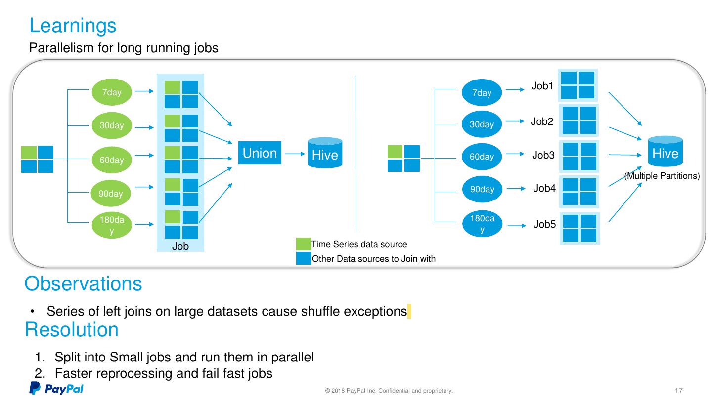 17 .Learnings Parallelism for long running jobs Job1 7day 7day 30day 30day Job2 60day Union Hive 60day Job3 Hive (Multiple Partitions) 90day 90day Job4 180da 180da y Job5 y Job Time Series data source Other Data sources to Join with Observations • Series of left joins on large datasets cause shuffle exceptions Resolution 1. Split into Small jobs and run them in parallel 2. Faster reprocessing and fail fast jobs © 2018 PayPal Inc. Confidential and proprietary. 17