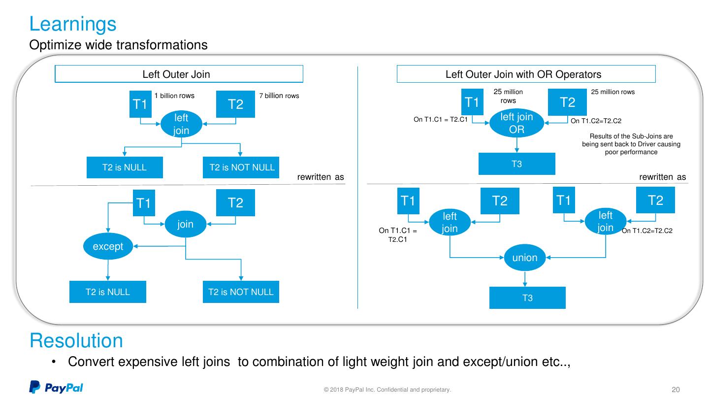 19 .Learnings Optimize joins for efficient use of cluster resources (Memory, CPU etc..,) Start Read Read Table Table 2 1 Join Process Observation With the default shuffle partitions of 200, the Join Stage was running with too many tasks causing performance overhead Resolution Reduce the spark.sql.shuffle.partitions settings to a lower threshold © 2018 PayPal Inc. Confidential and proprietary. 19
