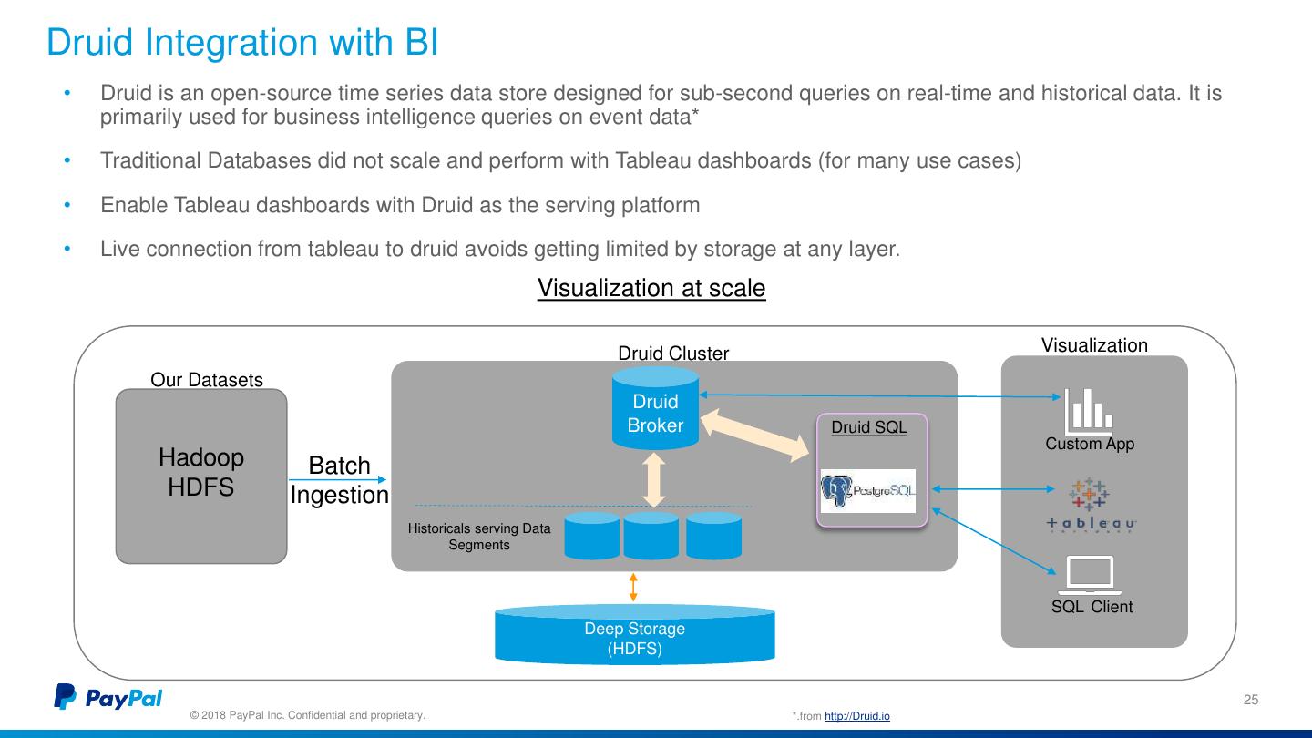 25 .Druid Integration with BI • Druid is an open-source time series data store designed for sub-second queries on real-time and historical data. It is primarily used for business intelligence queries on event data* • Traditional Databases did not scale and perform with Tableau dashboards (for many use cases) • Enable Tableau dashboards with Druid as the serving platform • Live connection from tableau to druid avoids getting limited by storage at any layer. Visualization at scale Druid Cluster Visualization Our Datasets Druid Broker Druid SQL Custom App Hadoop Batch HDFS Ingestion Historicals serving Data Segments SQL Client Deep Storage (HDFS) 25 © 2018 PayPal Inc. Confidential and proprietary. *.from http://Druid.io