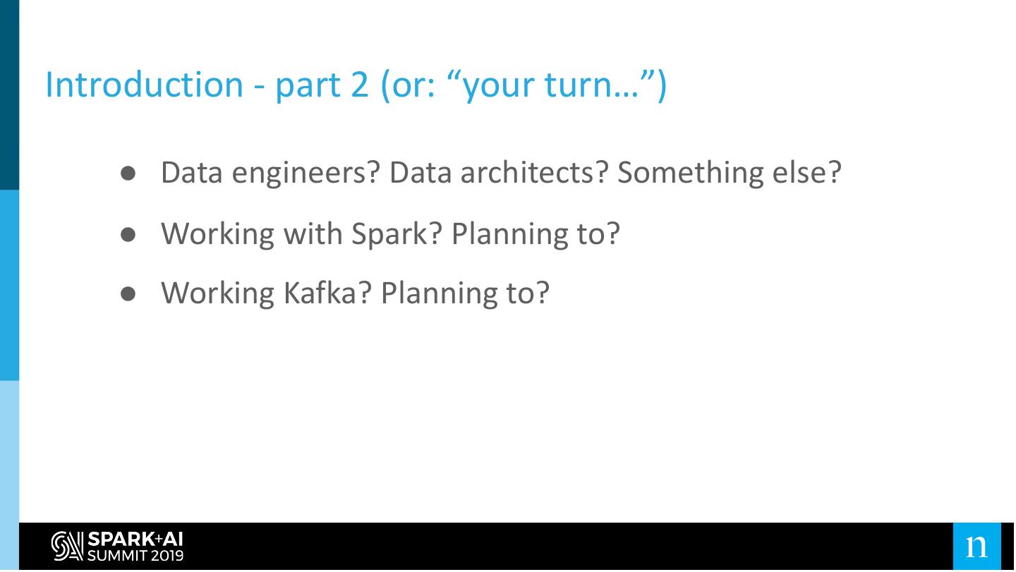 4 .Introduction - part 2 (or: “your turn…”) ● Data engineers? Data architects? Something else? ● Working with Spark? Planning to? ● Working Kafka? Planning to?