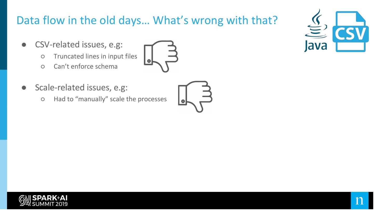 10 .Data flow in the old days… What’s wrong with that? ● CSV-related issues, e.g: ○ Truncated lines in input files ○ Can’t enforce schema ● Scale-related issues, e.g: ○ Had to “manually” scale the processes