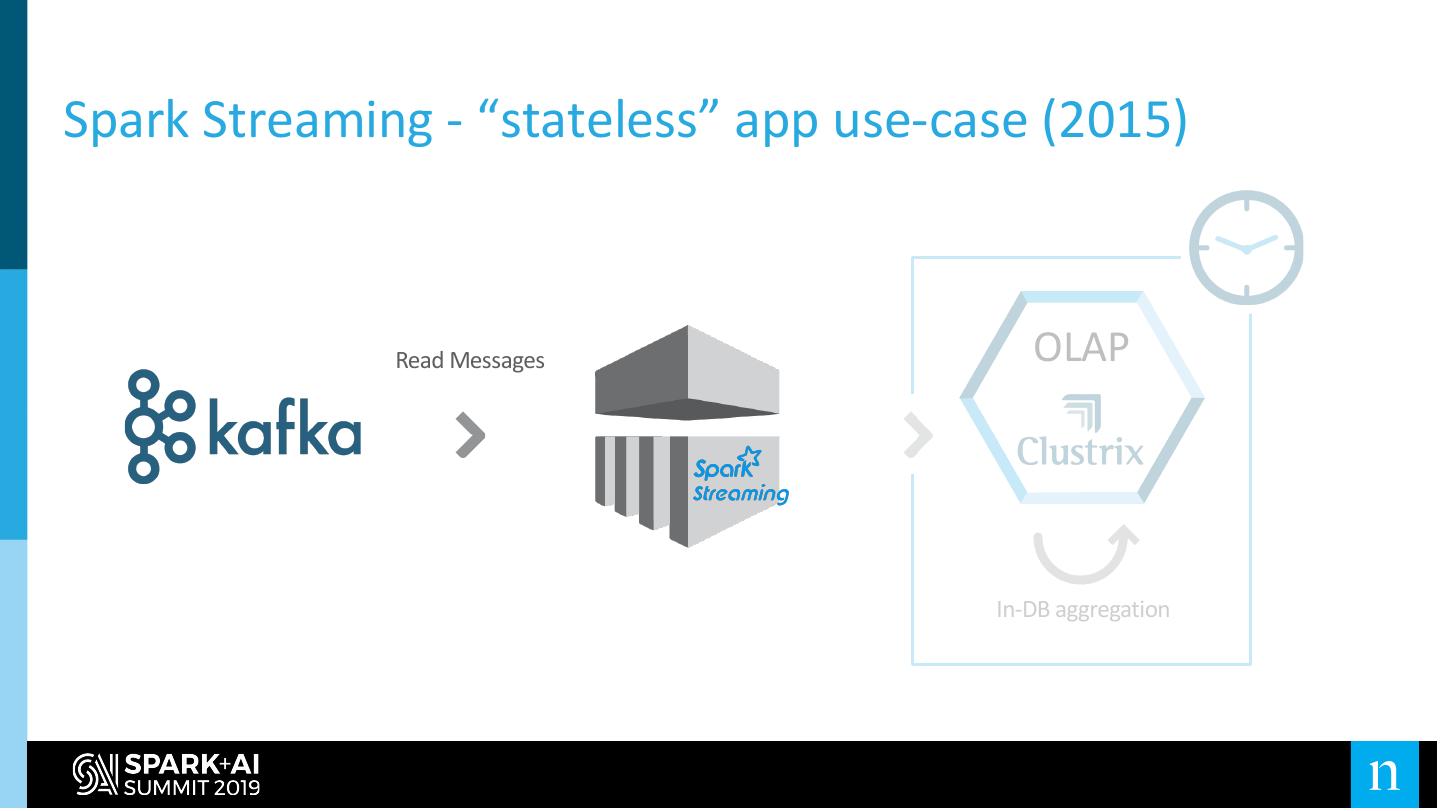 14 .Spark Streaming - “stateless” app use-case (2015) Read Messages OLAP In-DB aggregation