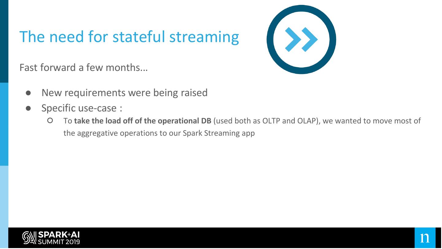 15 .The need for stateful streaming Fast forward a few months... ● New requirements were being raised ● Specific use-case : ○ To take the load off of the operational DB (used both as OLTP and OLAP), we wanted to move most of the aggregative operations to our Spark Streaming app