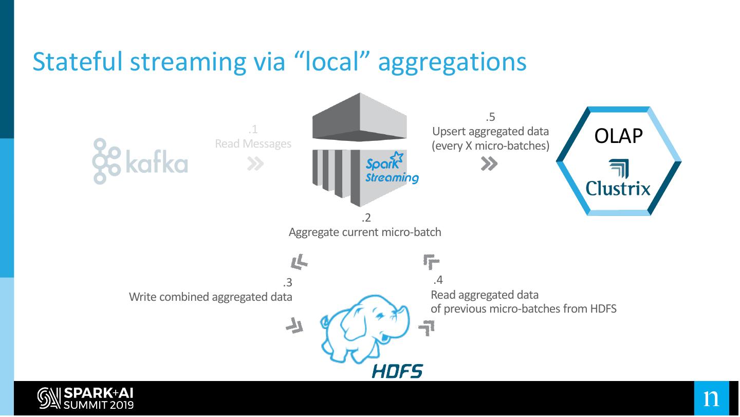 16 .Stateful streaming via “local” aggregations .5 .1 Read Messages Upsert aggregated data (every X micro-batches) OLAP .2 Aggregate current micro-batch .3 .4 Write combined aggregated data Read aggregated data of previous micro-batches from HDFS