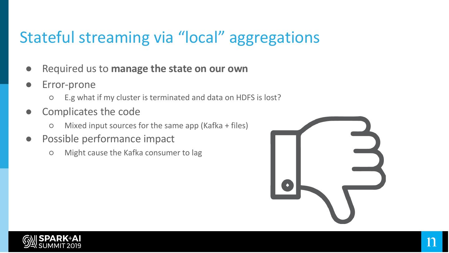 17 .Stateful streaming via “local” aggregations ● Required us to manage the state on our own ● Error-prone ○ E.g what if my cluster is terminated and data on HDFS is lost? ● Complicates the code ○ Mixed input sources for the same app (Kafka + files) ● Possible performance impact ○ Might cause the Kafka consumer to lag