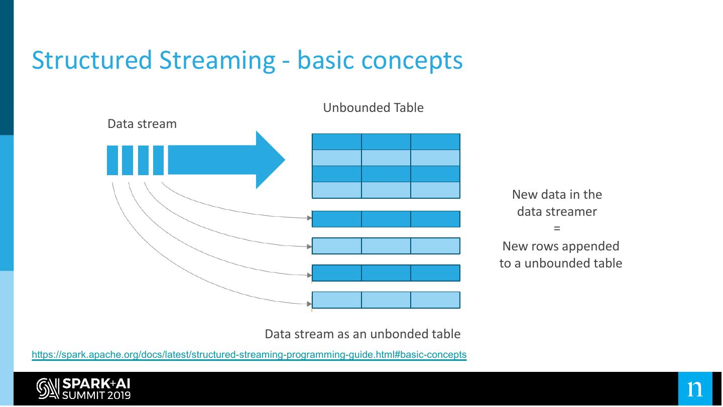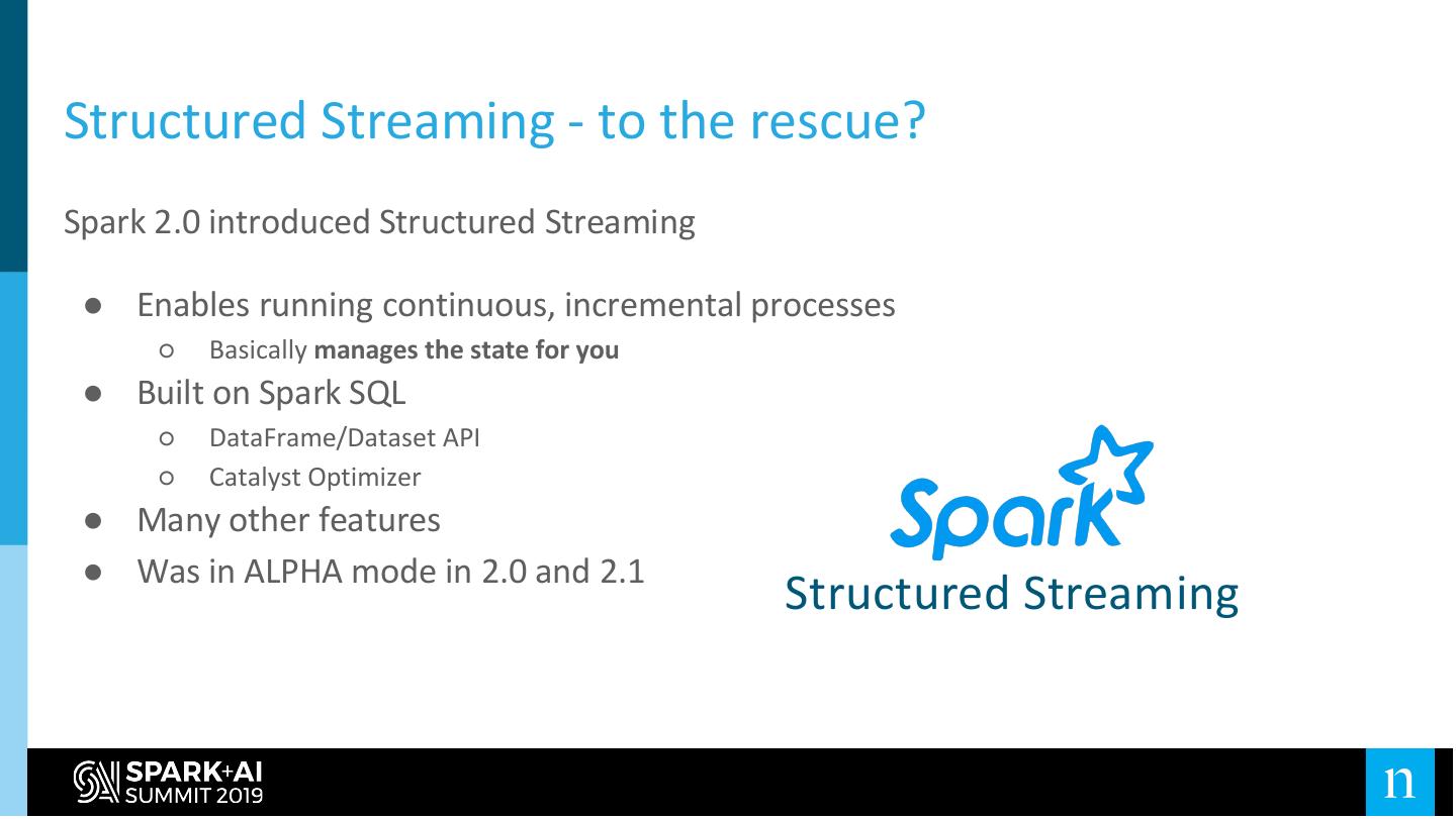 18 .Structured Streaming - to the rescue? Spark 2.0 introduced Structured Streaming ● Enables running continuous, incremental processes ○ Basically manages the state for you ● Built on Spark SQL ○ DataFrame/Dataset API ○ Catalyst Optimizer ● Many other features ● Was in ALPHA mode in 2.0 and 2.1 Structured Streaming