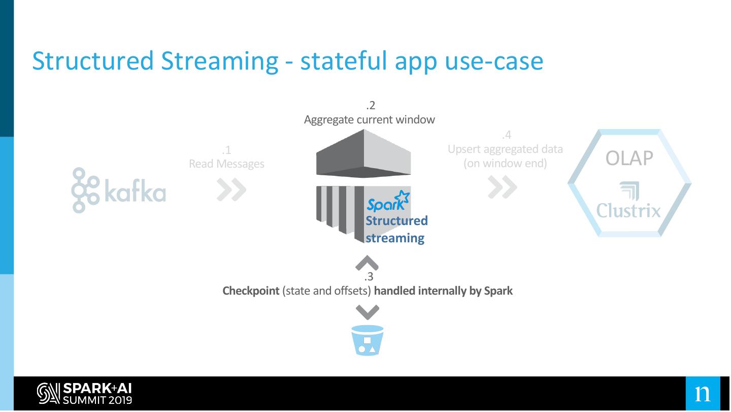 19 .Structured Streaming - stateful app use-case .2 Aggregate current window .4 .1 Upsert aggregated data Read Messages (on window end) OLAP Structured streaming .3 Checkpoint (state and offsets) handled internally by Spark