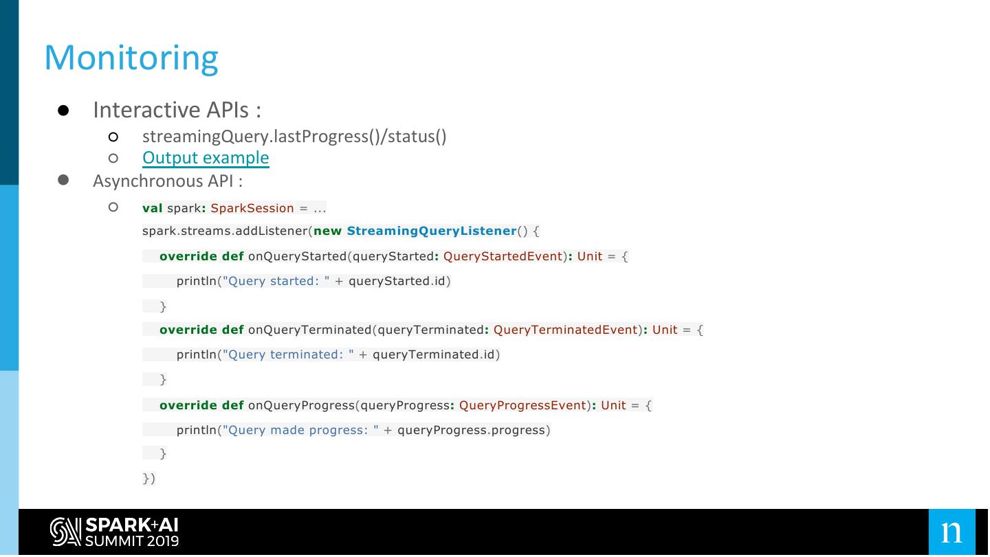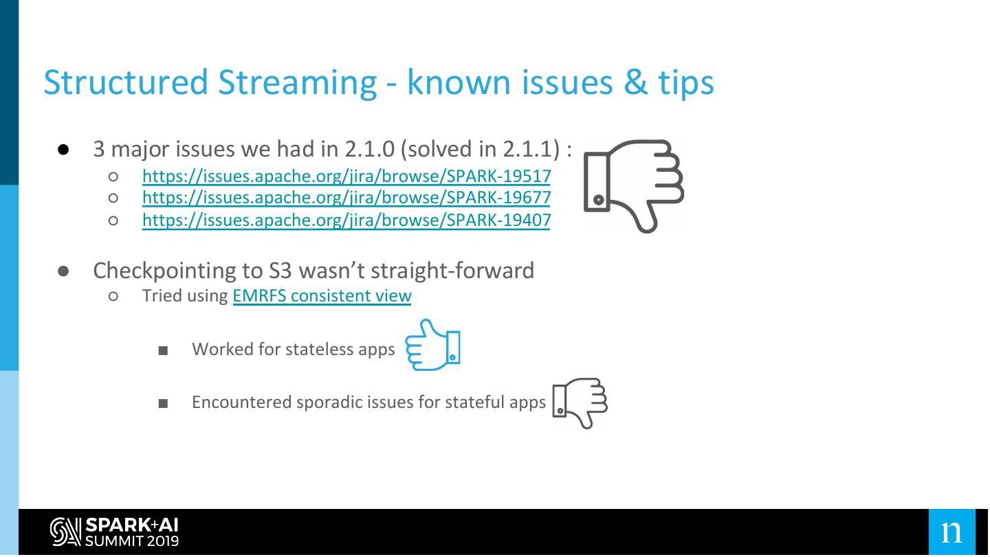 20 .Structured Streaming - known issues & tips ● 3 major issues we had in 2.1.0 (solved in 2.1.1) : ○ https://issues.apache.org/jira/browse/SPARK-19517 ○ https://issues.apache.org/jira/browse/SPARK-19677 ○ https://issues.apache.org/jira/browse/SPARK-19407 ● Checkpointing to S3 wasn’t straight-forward ○ Tried using EMRFS consistent view ■ Worked for stateless apps ■ Encountered sporadic issues for stateful apps