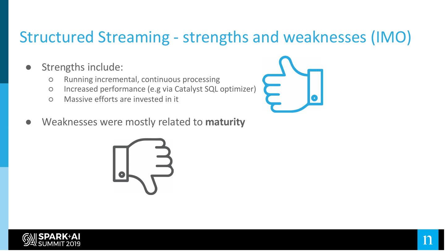 21 .Structured Streaming - strengths and weaknesses (IMO) ● Strengths include: ○ Running incremental, continuous processing ○ Increased performance (e.g via Catalyst SQL optimizer) ○ Massive efforts are invested in it ● Weaknesses were mostly related to maturity
