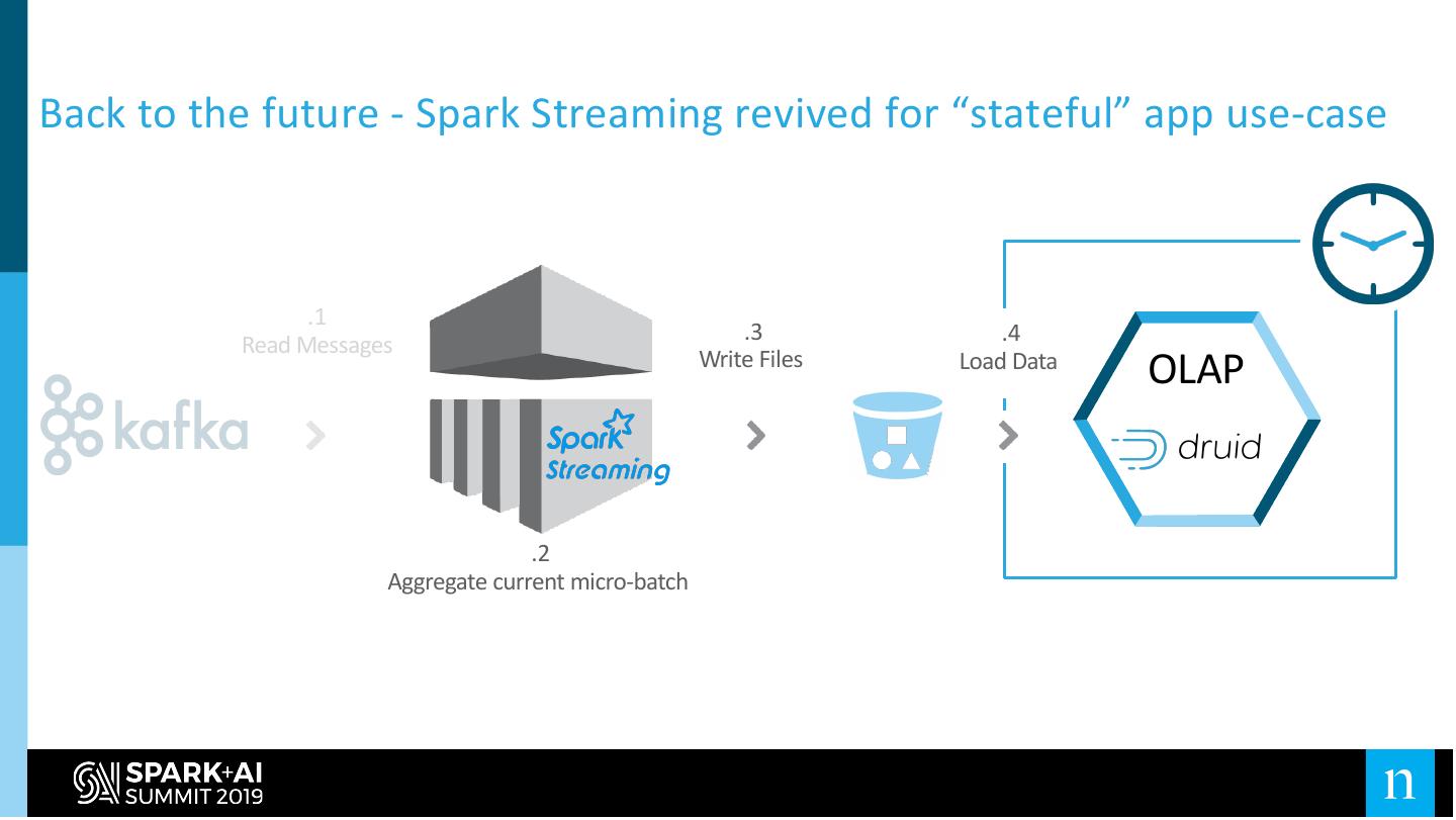 22 .Back to the future - Spark Streaming revived for “stateful” app use-case .1 .3 .4 Read Messages Write Files Load Data OLAP .2 Aggregate current micro-batch