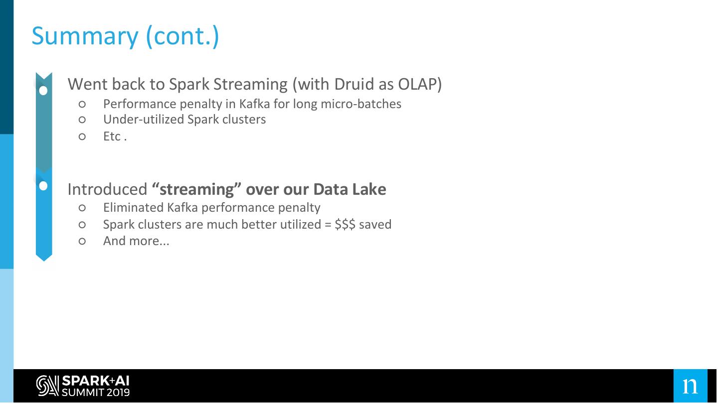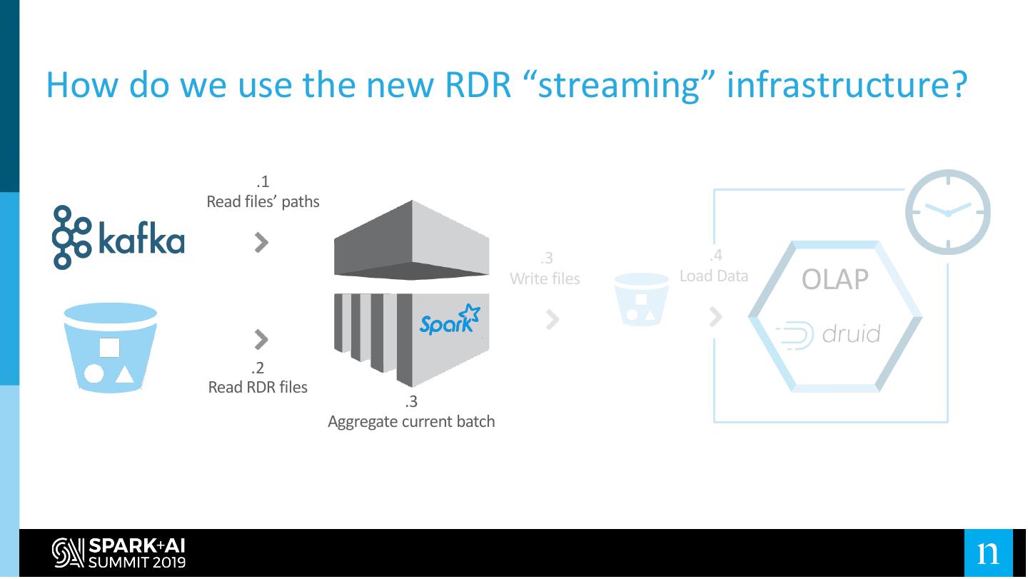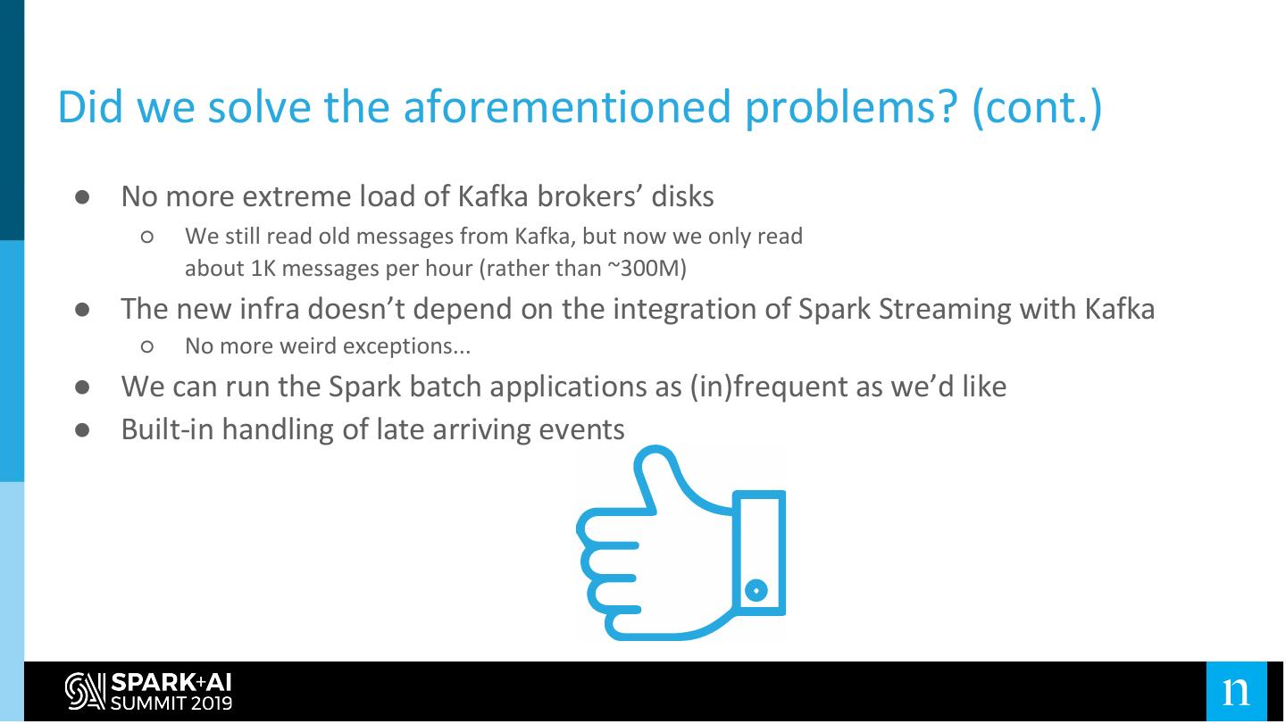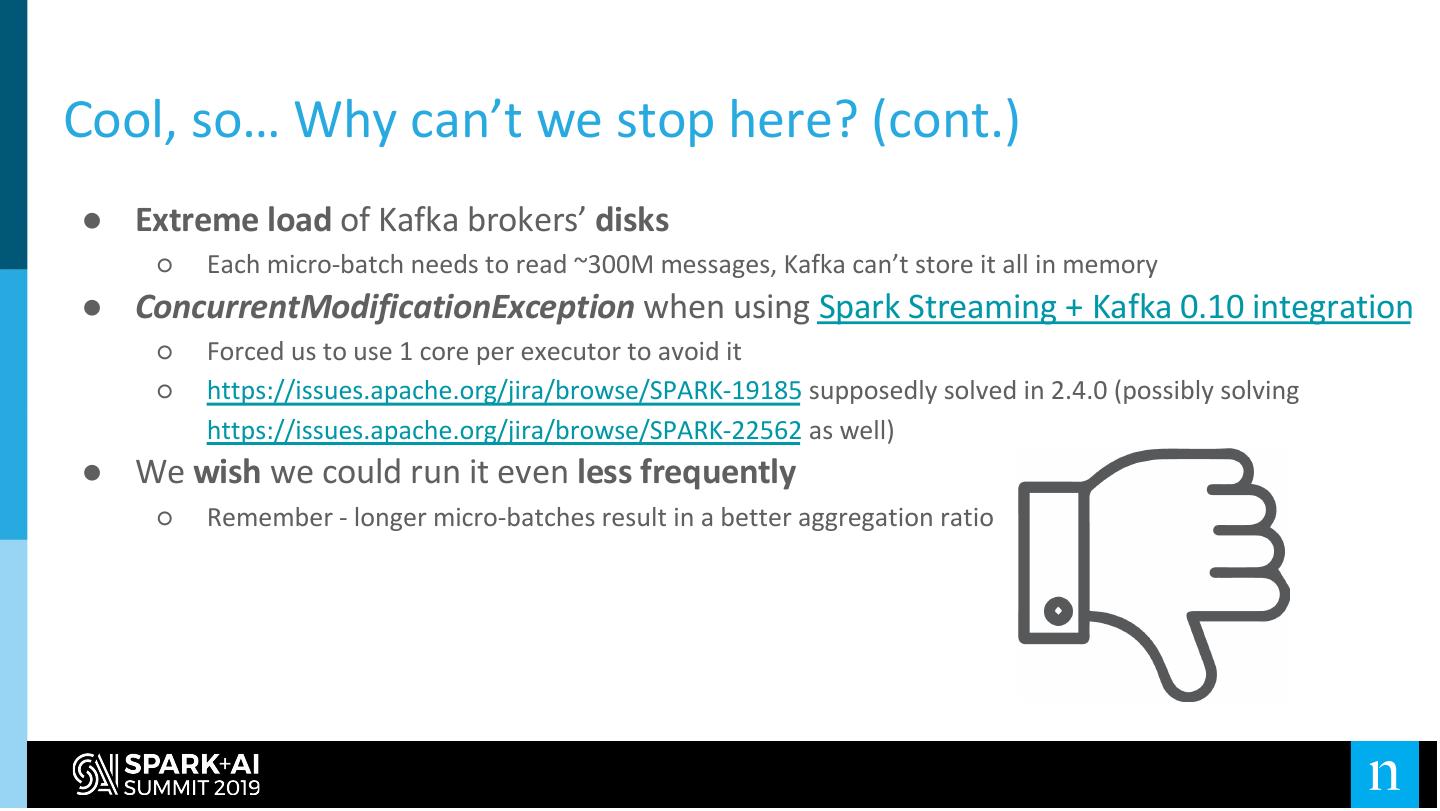 24 .Cool, so… Why can’t we stop here? (cont.) ● Extreme load of Kafka brokers’ disks ○ Each micro-batch needs to read ~300M messages, Kafka can’t store it all in memory ● ConcurrentModificationException when using Spark Streaming + Kafka 0.10 integration ○ Forced us to use 1 core per executor to avoid it ○ https://issues.apache.org/jira/browse/SPARK-19185 supposedly solved in 2.4.0 (possibly solving https://issues.apache.org/jira/browse/SPARK-22562 as well) ● We wish we could run it even less frequently ○ Remember - longer micro-batches result in a better aggregation ratio