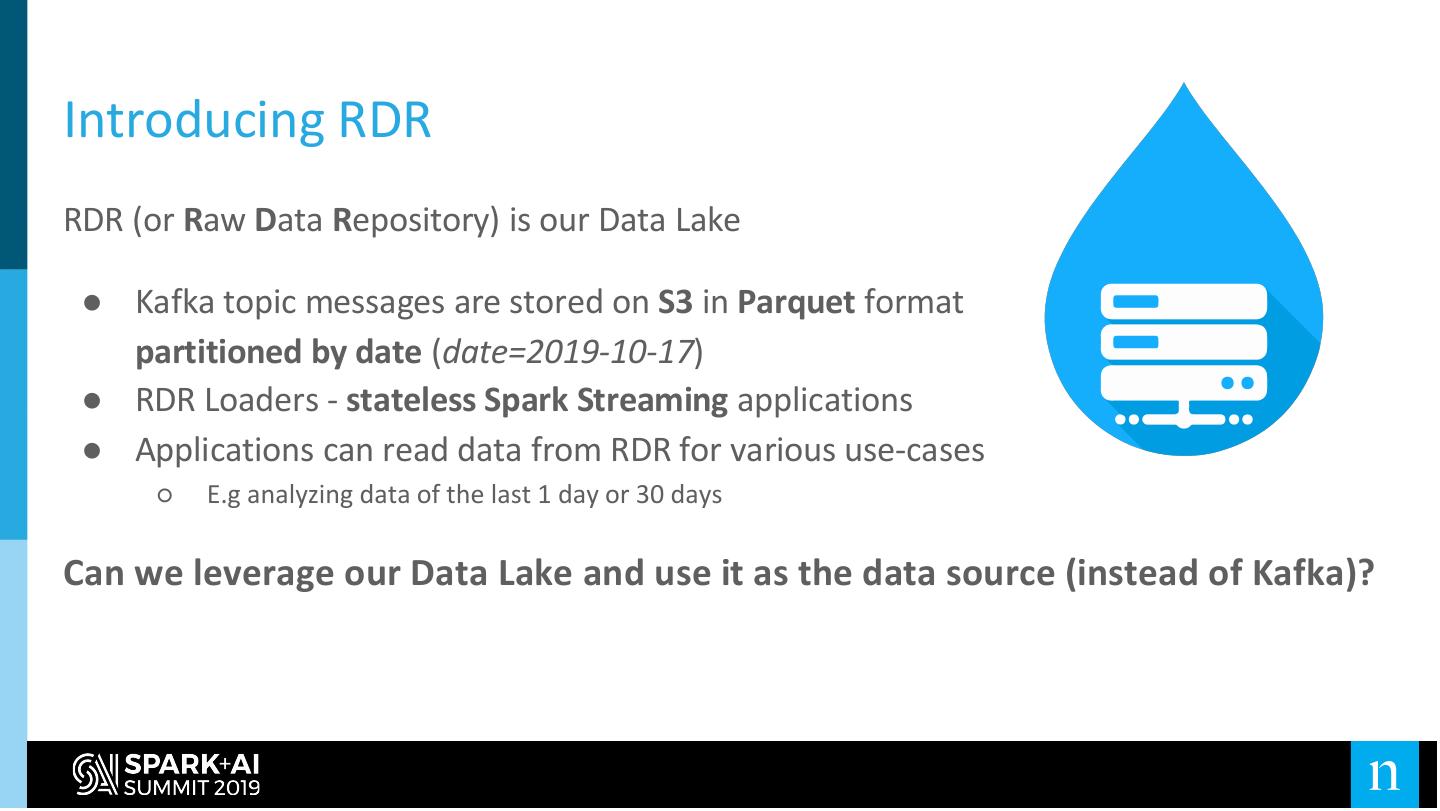 25 .Introducing RDR RDR (or Raw Data Repository) is our Data Lake ● Kafka topic messages are stored on S3 in Parquet format partitioned by date (date=2019-10-17) ● RDR Loaders - stateless Spark Streaming applications ● Applications can read data from RDR for various use-cases ○ E.g analyzing data of the last 1 day or 30 days Can we leverage our Data Lake and use it as the data source (instead of Kafka)?