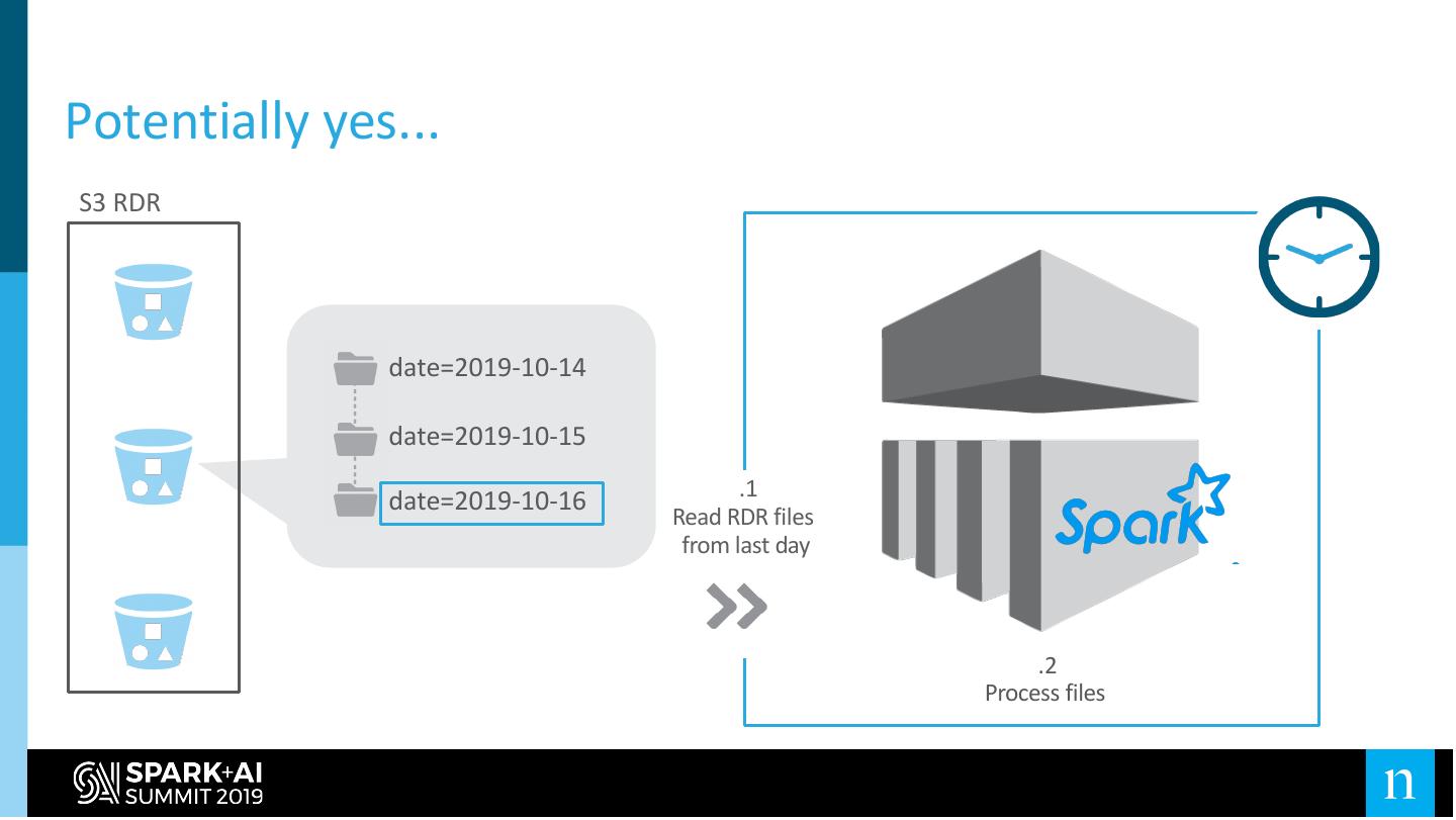 26 .Potentially yes... S3 RDR date=2019-10-14 date=2019-10-15 .1 date=2019-10-16 Read RDR files from last day .2 Process files