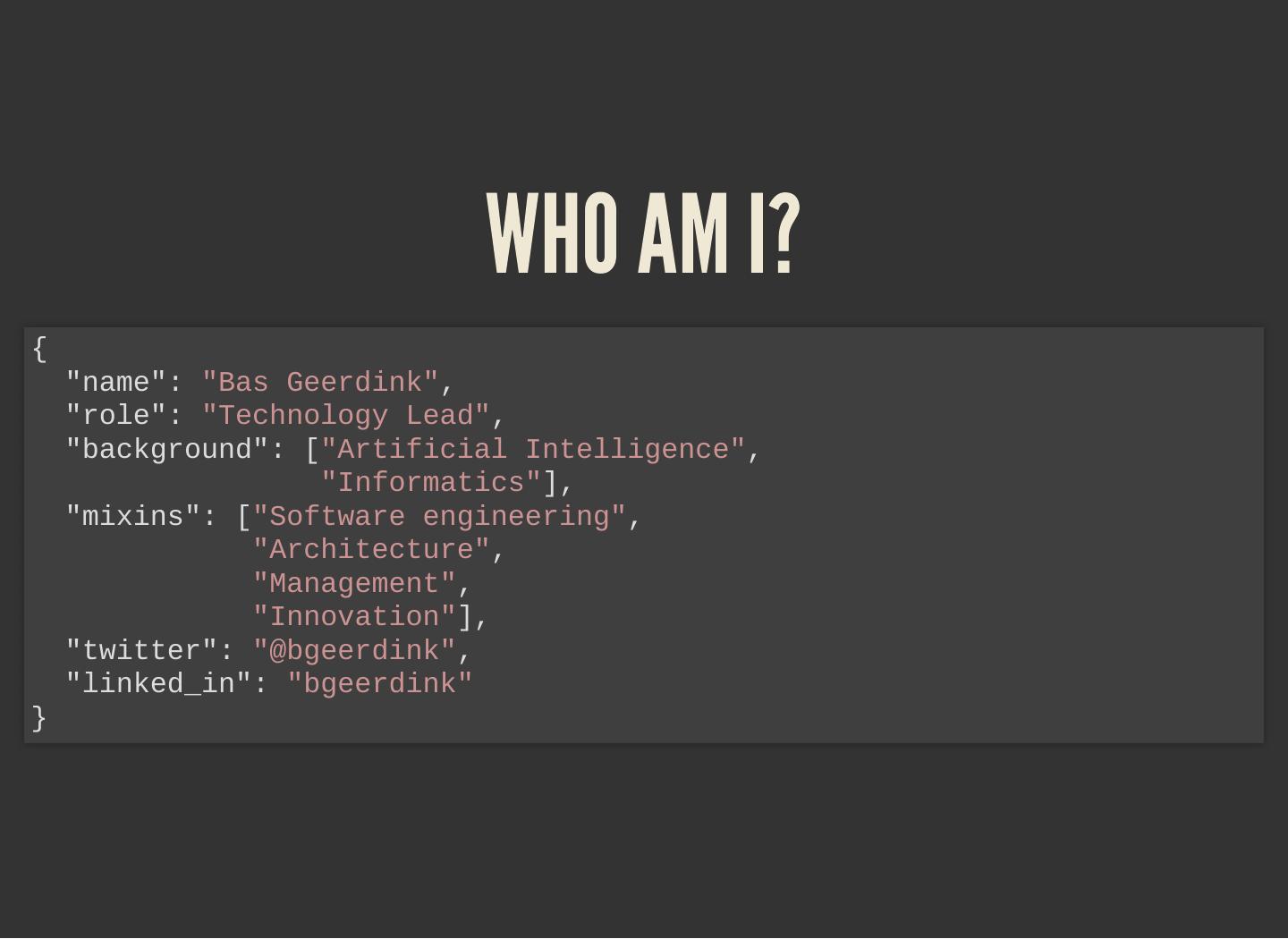 2 . WHO AM I? { "name": "Bas Geerdink", "role": "Technology Lead", "background": ["Artificial Intelligence", "Informatics"], "mixins": ["Software engineering", "Architecture", "Management", "Innovation"], "twitter": "@bgeerdink", "linked_in": "bgeerdink" }
