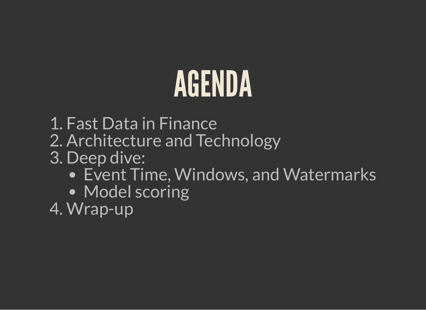3 . AGENDA 1. Fast Data in Finance 2. Architecture and Technology 3. Deep dive: Event Time, Windows, and Watermarks Model scoring 4. Wrap-up