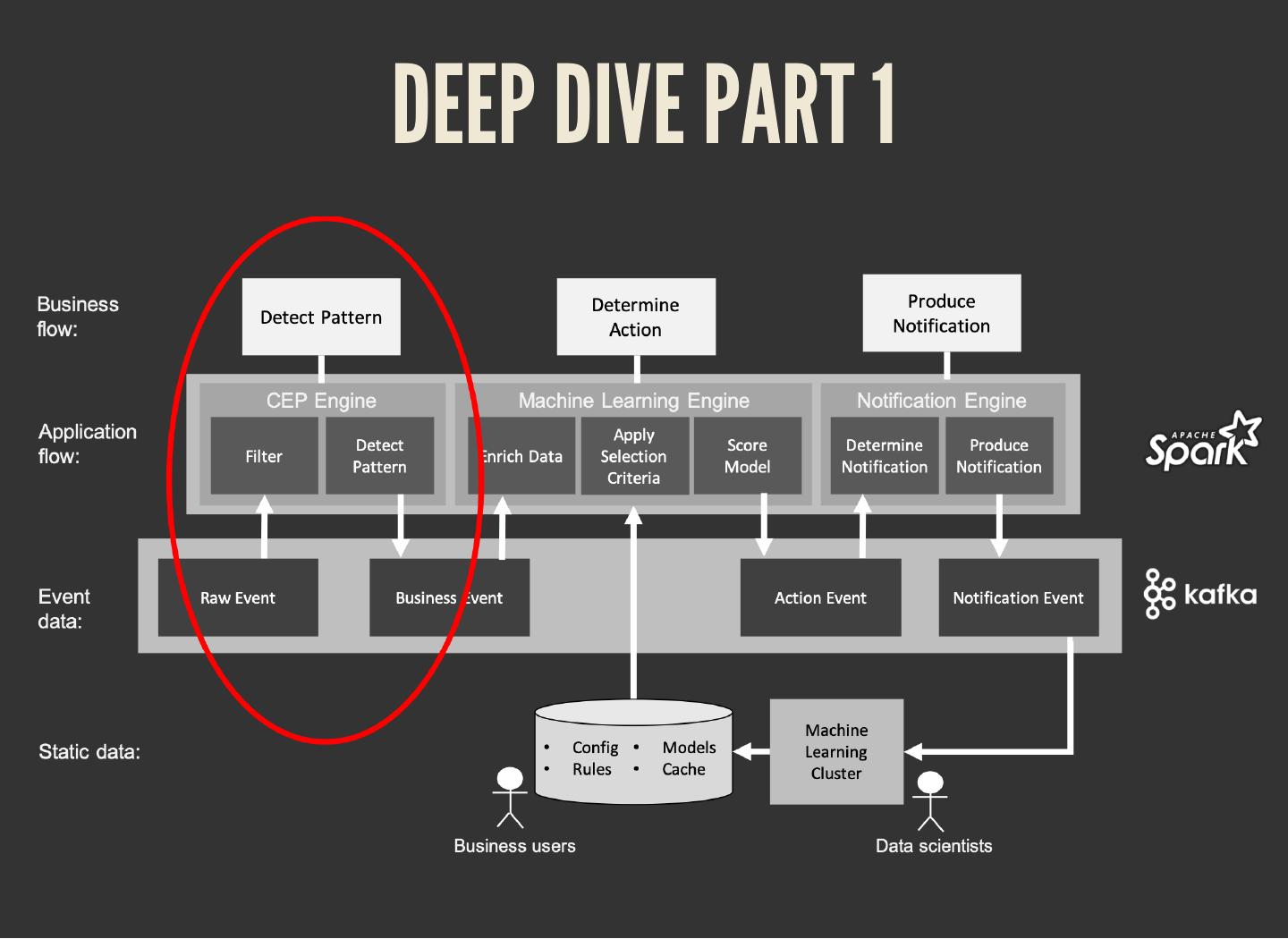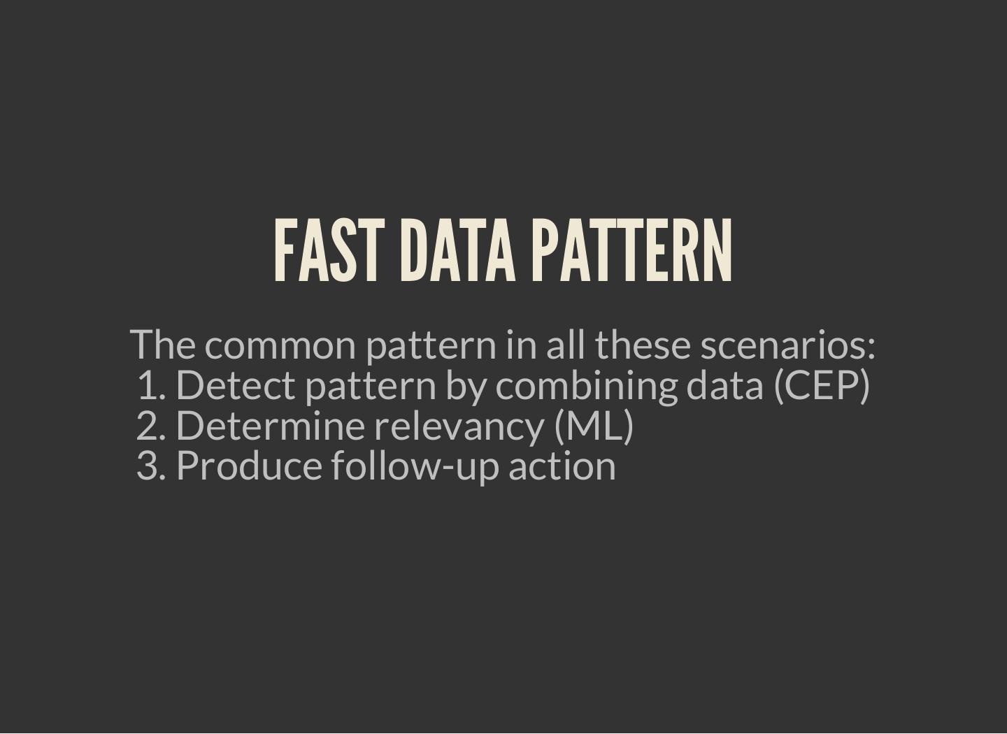 6 . FAST DATA PATTERN The common pattern in all these scenarios: 1. Detect pattern by combining data (CEP) 2. Determine relevancy (ML) 3. Produce follow-up action