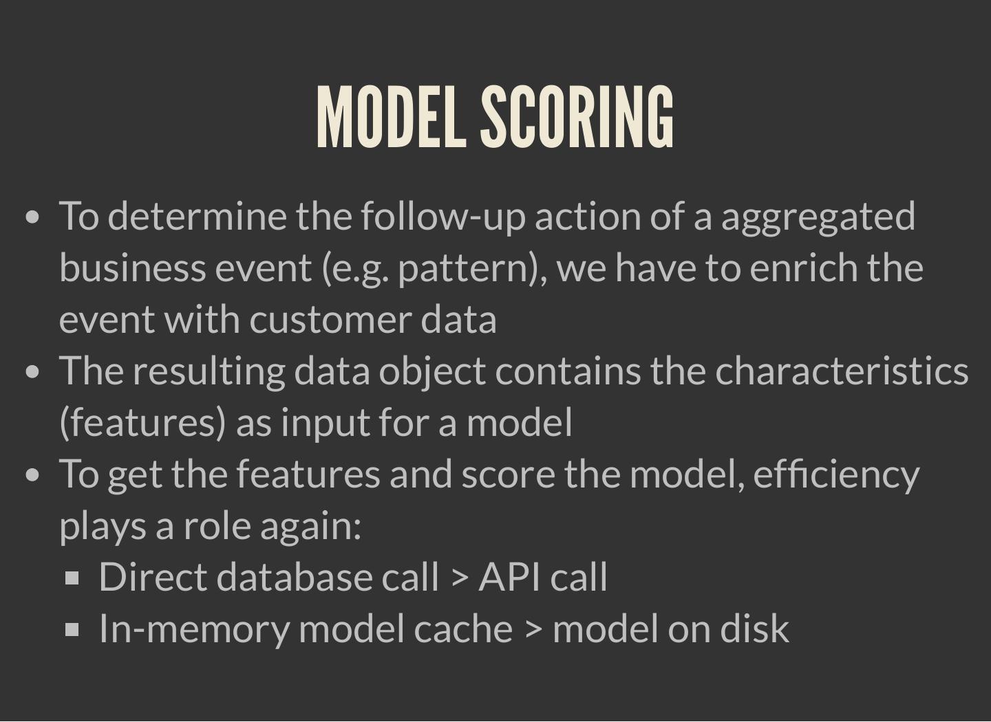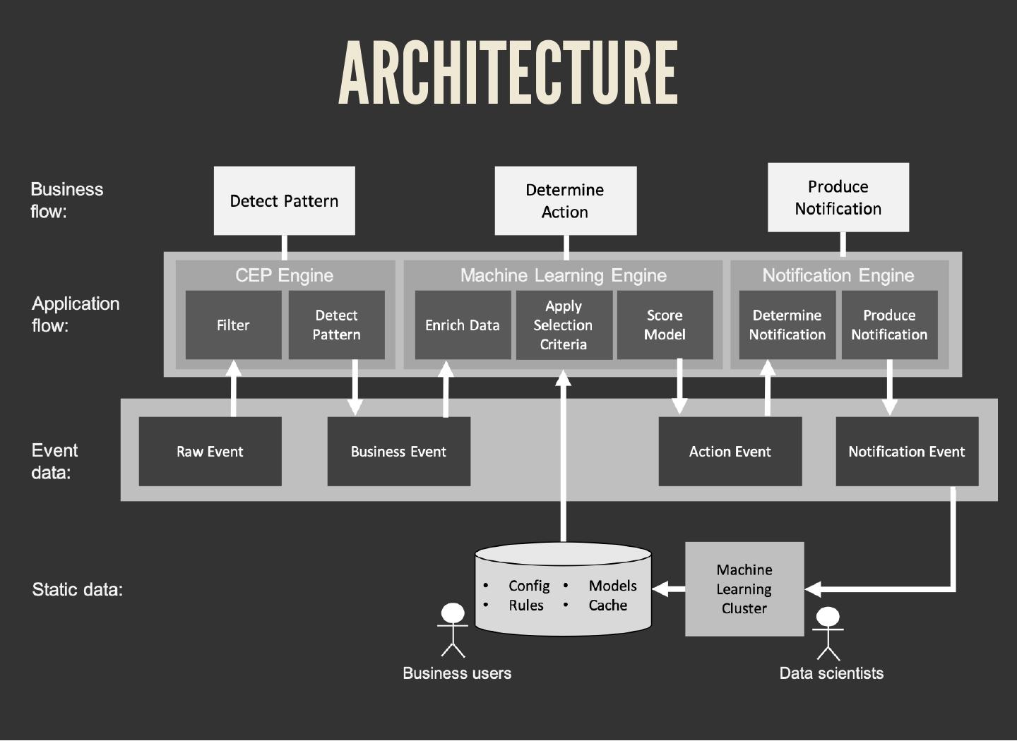 A typical streaming analytics solution follows a ‘pipes and filters’ pattern that consists of three main steps: detecting patterns on raw event data (Complex Event Processing), evaluating the outcomes with the aid of business rules and machine learning algorithms, and deciding on the next action. At the core of this architecture is the execution of predictive models that operate on enormous amounts of never-ending data streams.