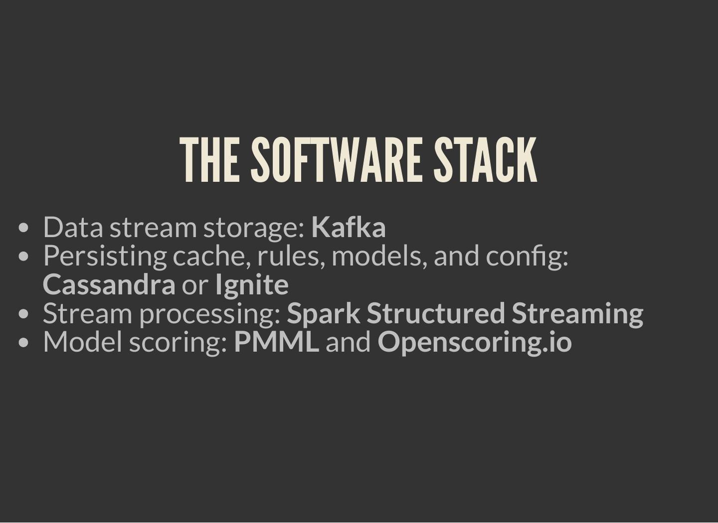 8 . THE SOFTWARE STACK Data stream storage: Kafka Persisting cache, rules, models, and con g: Cassandra or Ignite Stream processing: Spark Structured Streaming Model scoring: PMML and Openscoring.io
