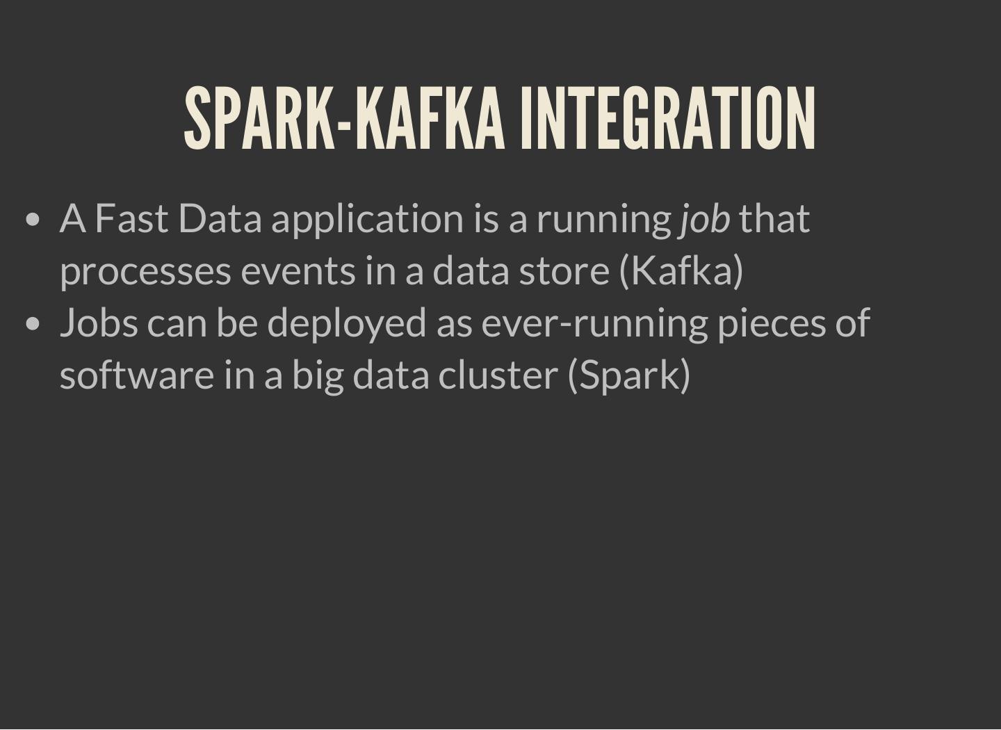 12 . SPARK-KAFKA INTEGRATION A Fast Data application is a running job that processes events in a data store (Kafka) Jobs can be deployed as ever-running pieces of software in a big data cluster (Spark)