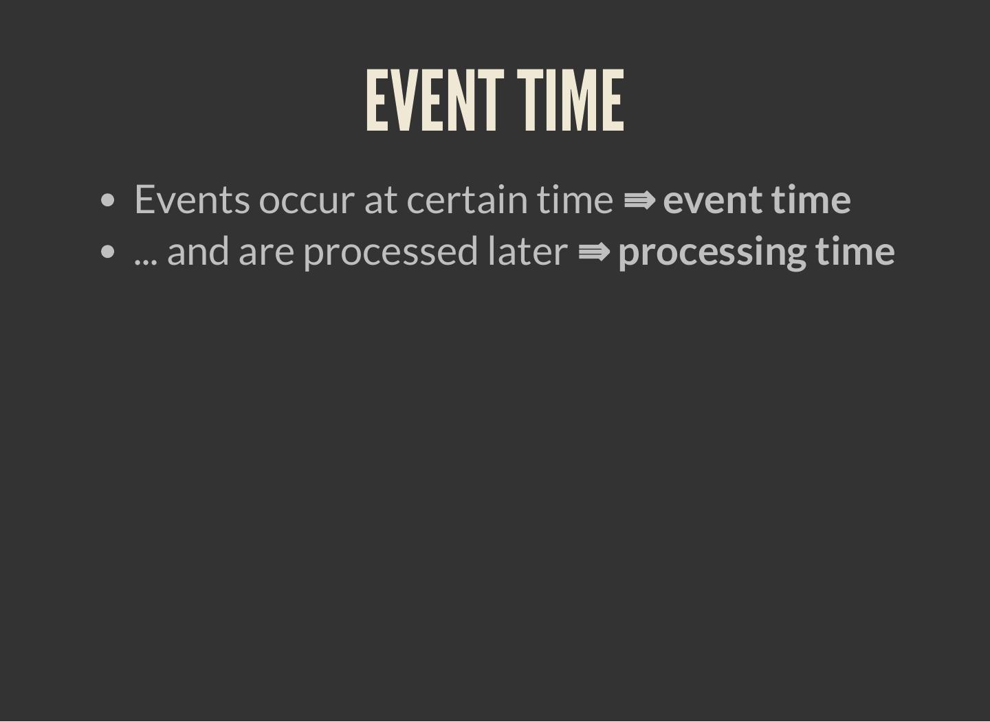 18 . EVENT TIME Events occur at certain time ⇛ event time ... and are processed later ⇛ processing time