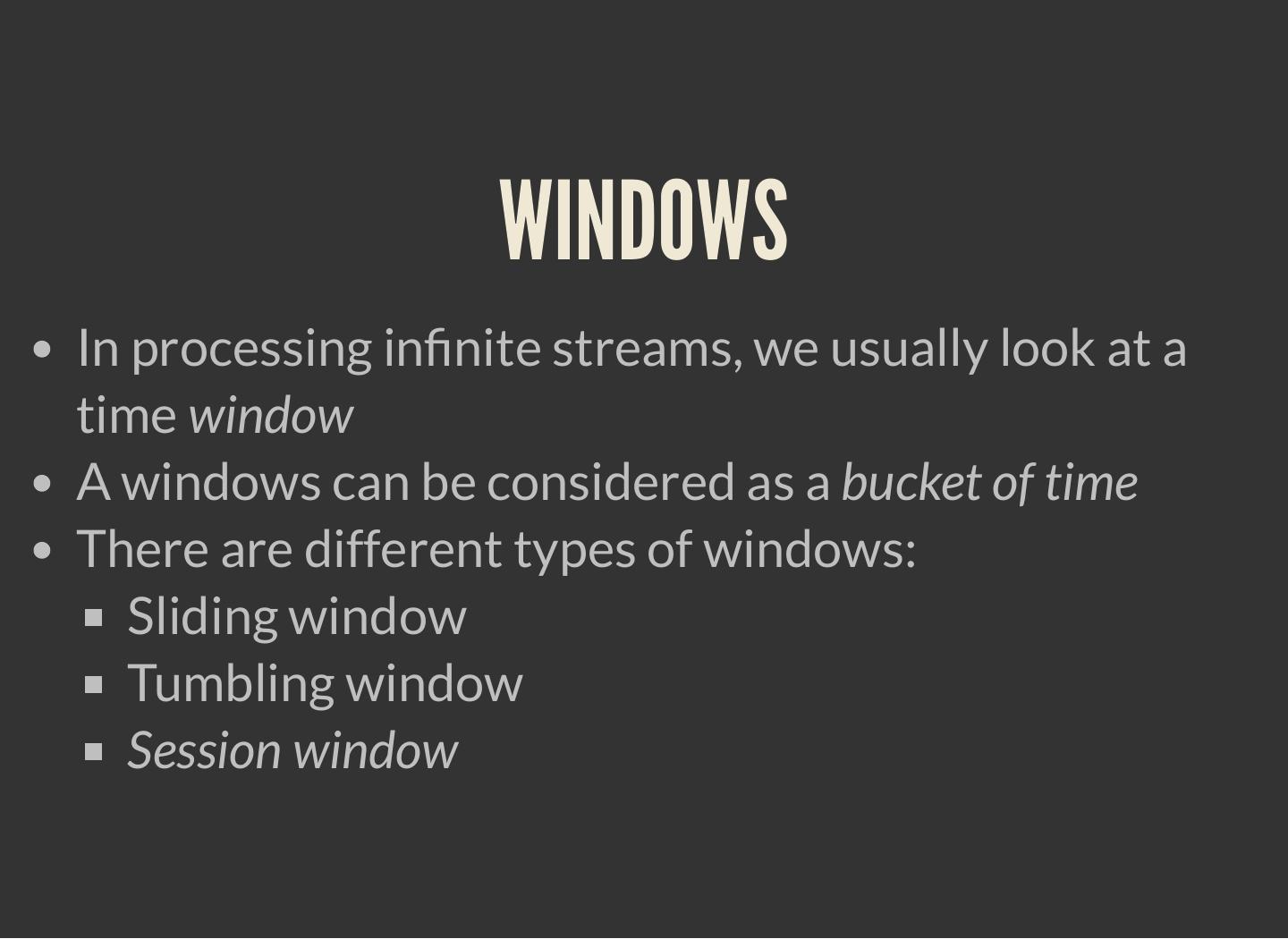 21 . WINDOWS In processing in nite streams, we usually look at a time window A windows can be considered as a bucket of time There are different types of windows: Sliding window Tumbling window Session window