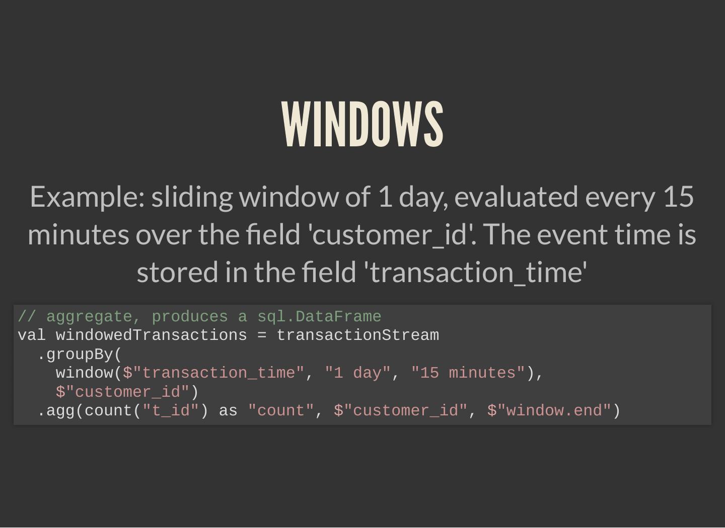 24 . WINDOWS Example: sliding window of 1 day, evaluated every 15 minutes over the eld 'customer_id'. The event time is stored in the eld 'transaction_time' // aggregate, produces a sql.DataFrame val windowedTransactions = transactionStream .groupBy( window($"transaction_time", "1 day", "15 minutes"), $"customer_id") .agg(count("t_id") as "count", $"customer_id", $"window.end")