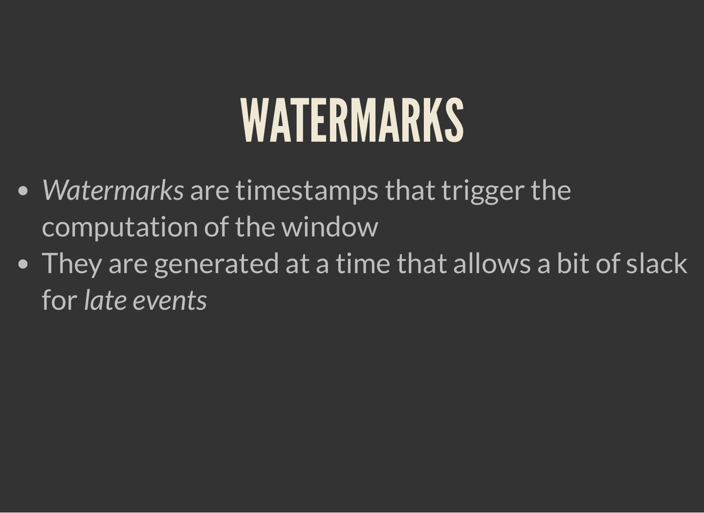 26 . WATERMARKS Watermarks are timestamps that trigger the computation of the window They are generated at a time that allows a bit of slack for late events Any event that reaches the processor later than the watermark, but with an event time that should belong to the former window, is ignored