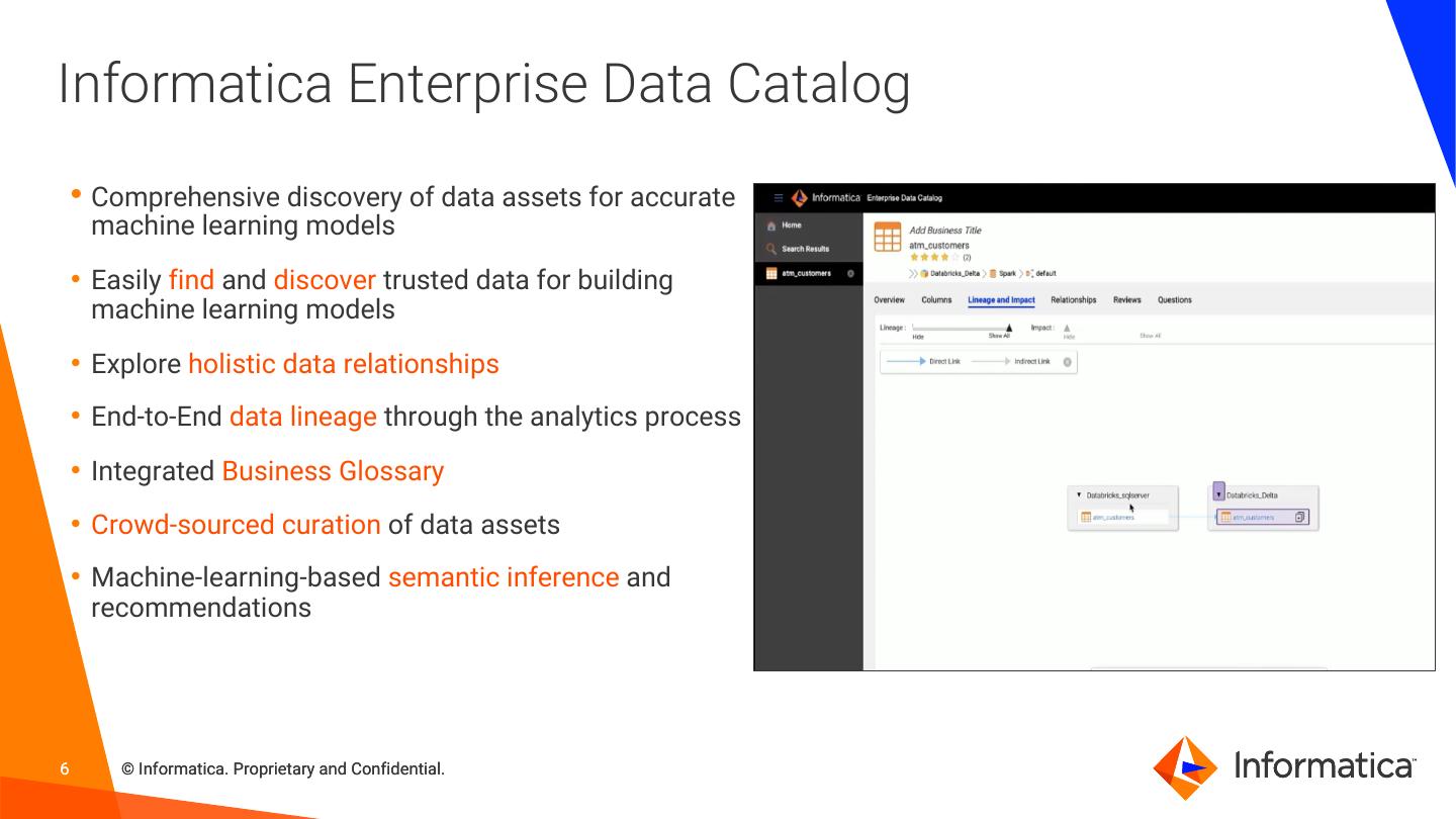 5 . Informatica + Databricks Accelerate Data Engineering Pipelines for AI & Analytics Informatica Data Engineering Integration Data Pipeline Development Informatica Cloud Data Integration Data Ingestion from Hybrid Sources Reliable Data Lakes at Scale Data Discovery, Audit and Lineage Informatica Enterprise Data Catalog