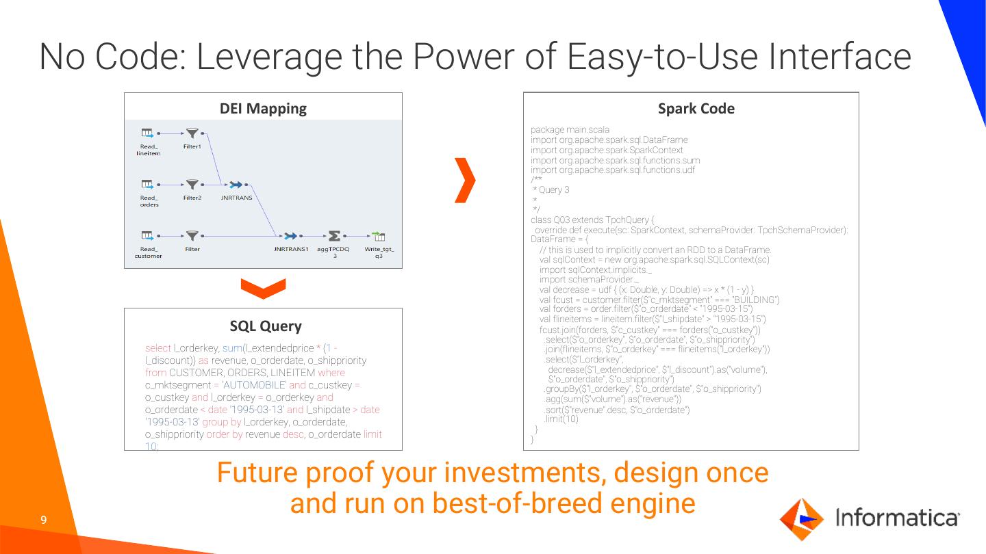 9 .No Code: Leverage the Power of Easy-to-Use Interface DEI Mapping Spark Code package main.scala import org.apache.spark.sql.DataFrame import org.apache.spark.SparkContext import org.apache.spark.sql.functions.sum import org.apache.spark.sql.functions.udf /** * Query 3 * */ class Q03 extends TpchQuery { override def execute(sc: SparkContext, schemaProvider: TpchSchemaProvider): DataFrame = { // this is used to implicitly convert an RDD to a DataFrame. val sqlContext = new org.apache.spark.sql.SQLContext(sc) import sqlContext.implicits._ import schemaProvider._ val decrease = udf { (x: Double, y: Double) => x * (1 - y) } val fcust = customer.filter($"c_mktsegment" === "BUILDING") val forders = order.filter($"o_orderdate" < "1995-03-15") val flineitems = lineitem.filter($"l_shipdate" > "1995-03-15") SQL Query fcust.join(forders, $"c_custkey" === forders("o_custkey")) .select($"o_orderkey", $"o_orderdate", $"o_shippriority") select l_orderkey, sum(l_extendedprice * (1 - .join(flineitems, $"o_orderkey" === flineitems("l_orderkey")) l_discount)) as revenue, o_orderdate, o_shippriority .select($"l_orderkey", from CUSTOMER, ORDERS, LINEITEM where decrease($"l_extendedprice", $"l_discount").as("volume"), $"o_orderdate", $"o_shippriority") c_mktsegment = 'AUTOMOBILE' and c_custkey = .groupBy($"l_orderkey", $"o_orderdate", $"o_shippriority") o_custkey and l_orderkey = o_orderkey and .agg(sum($"volume").as("revenue")) o_orderdate < date '1995-03-13' and l_shipdate > date .sort($"revenue".desc, $"o_orderdate") '1995-03-13' group by l_orderkey, o_orderdate, .limit(10) } o_shippriority order by revenue desc, o_orderdate limit } 10; Future proof your investments, design once 9 and run on best-of-breed engine © Informatica. Proprietary and Confidential.