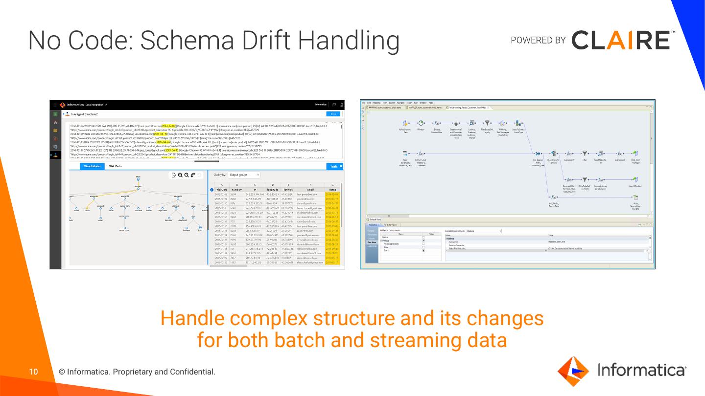 10 .No Code: Schema Drift Handling Handle complex structure and its changes for both batch and streaming data 10 © Informatica. Proprietary and Confidential.
