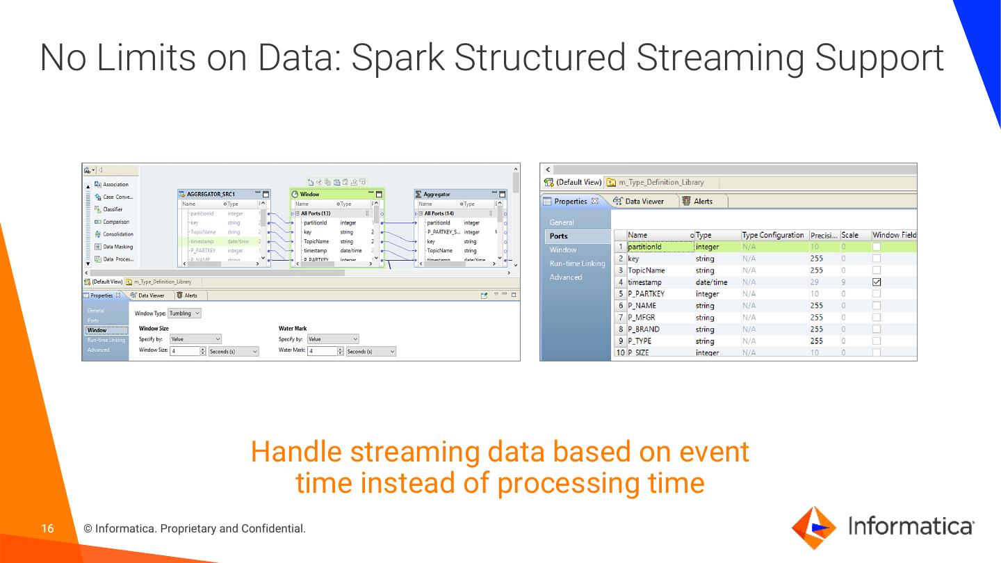 16 .No Limits on Data: Spark Structured Streaming Support Handle streaming data based on event time instead of processing time 16 © Informatica. Proprietary and Confidential.