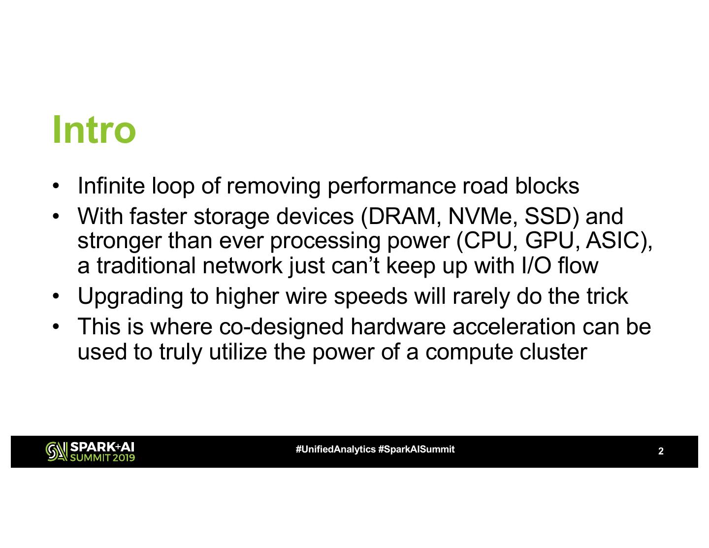 2 .Intro • Infinite loop of removing performance road blocks • With faster storage devices (DRAM, NVMe, SSD) and stronger than ever processing power (CPU, GPU, ASIC), a traditional network just can’t keep up with I/O flow • Upgrading to higher wire speeds will rarely do the trick • This is where co-designed hardware acceleration can be used to truly utilize the power of a compute cluster #UnifiedAnalytics #SparkAISummit 2