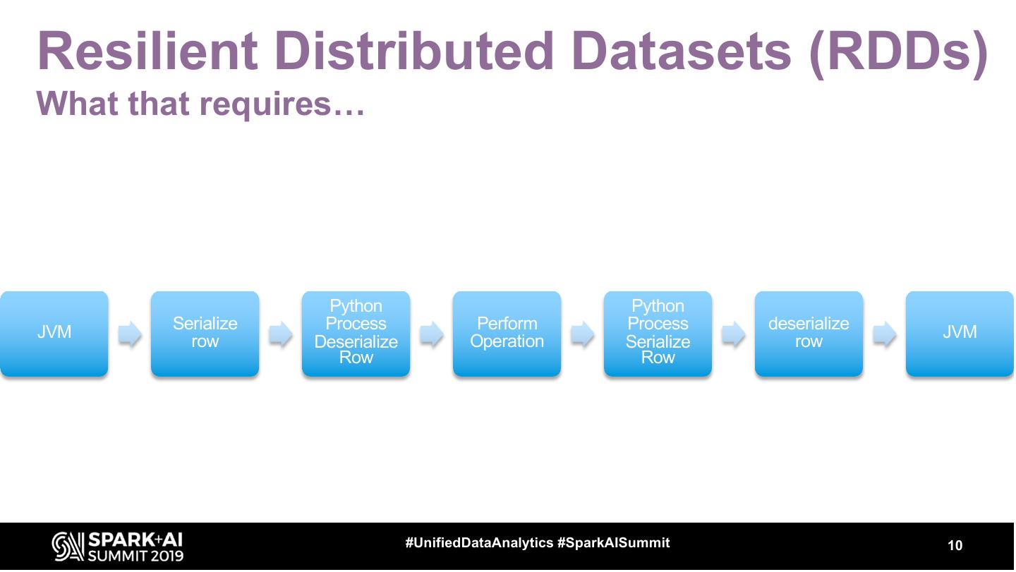 10 .Resilient Distributed Datasets (RDDs) What that requires… Python Python Serialize Process Perform Process deserialize JVM JVM row Deserialize Operation Serialize row Row Row #UnifiedDataAnalytics #SparkAISummit 10
