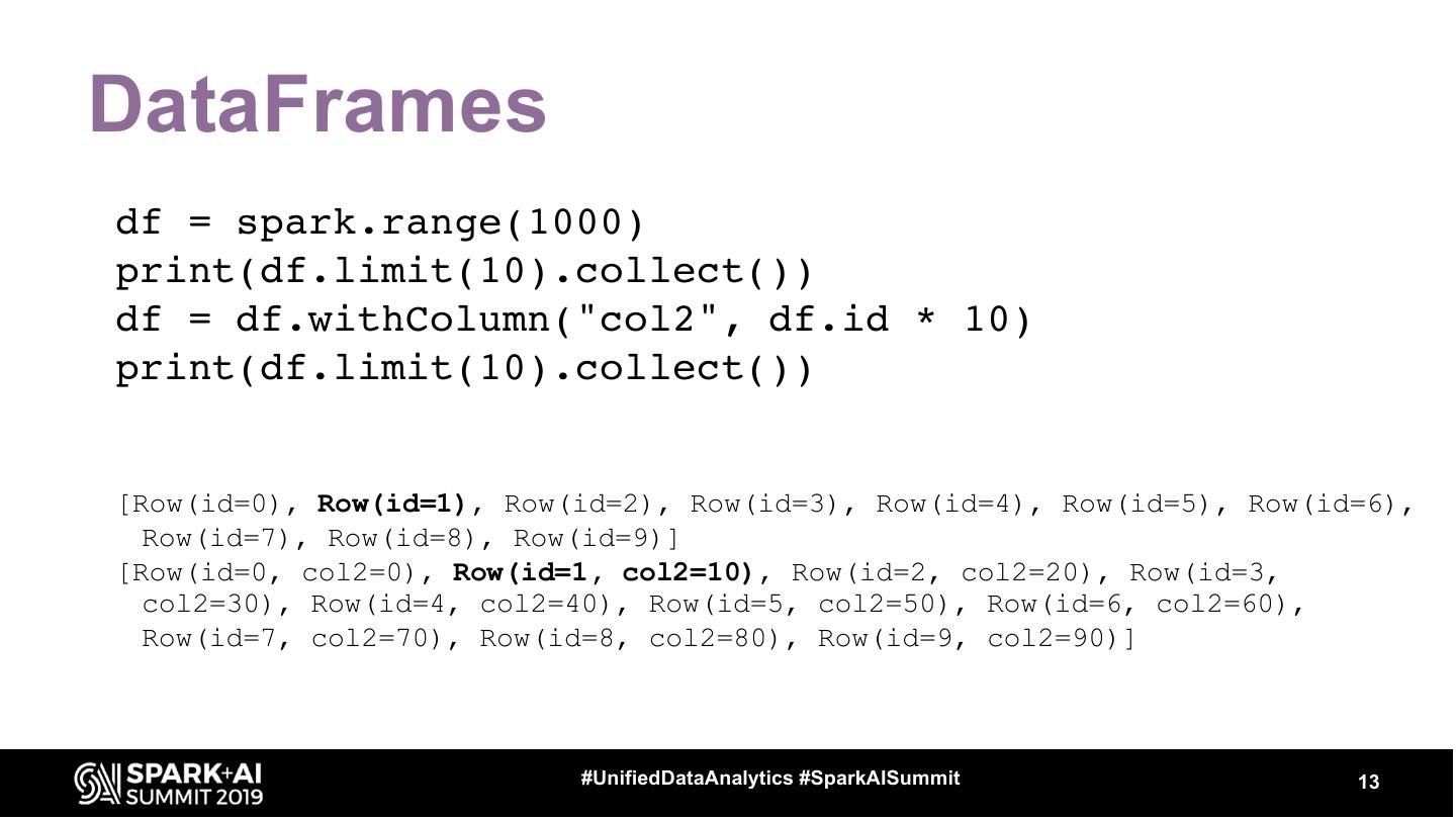 12 .DataFrames df = spark.range(1000) print(df.limit(10).collect()) df = df.withColumn("col2", df.id * 10) print(df.limit(10).collect()) [Row(id=0), Row(id=1), Row(id=2), Row(id=3), Row(id=4), Row(id=5), Row(id=6), Row(id=7), Row(id=8), Row(id=9)] [Row(id=0, col2=0), Row(id=1, col2=10), Row(id=2, col2=20), Row(id=3, col2=30), Row(id=4, col2=40), Row(id=5, col2=50), Row(id=6, col2=60), Row(id=7, col2=70), Row(id=8, col2=80), Row(id=9, col2=90)] #UnifiedDataAnalytics #SparkAISummit 12