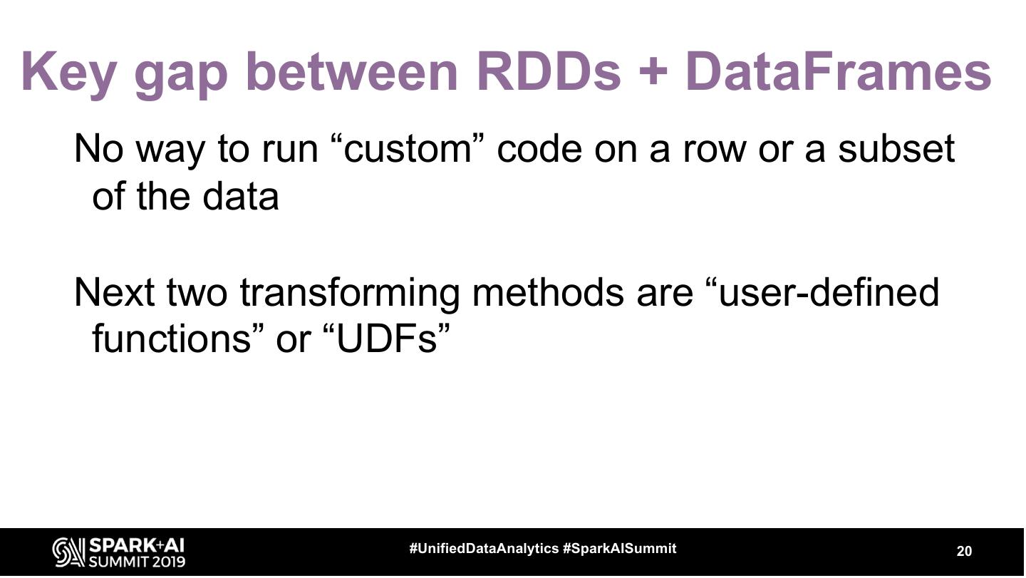 20 .Key gap between RDDs + DataFrames No way to run “custom” code on a row or a subset of the data Next two transforming methods are “user-defined functions” or “UDFs” #UnifiedDataAnalytics #SparkAISummit 20