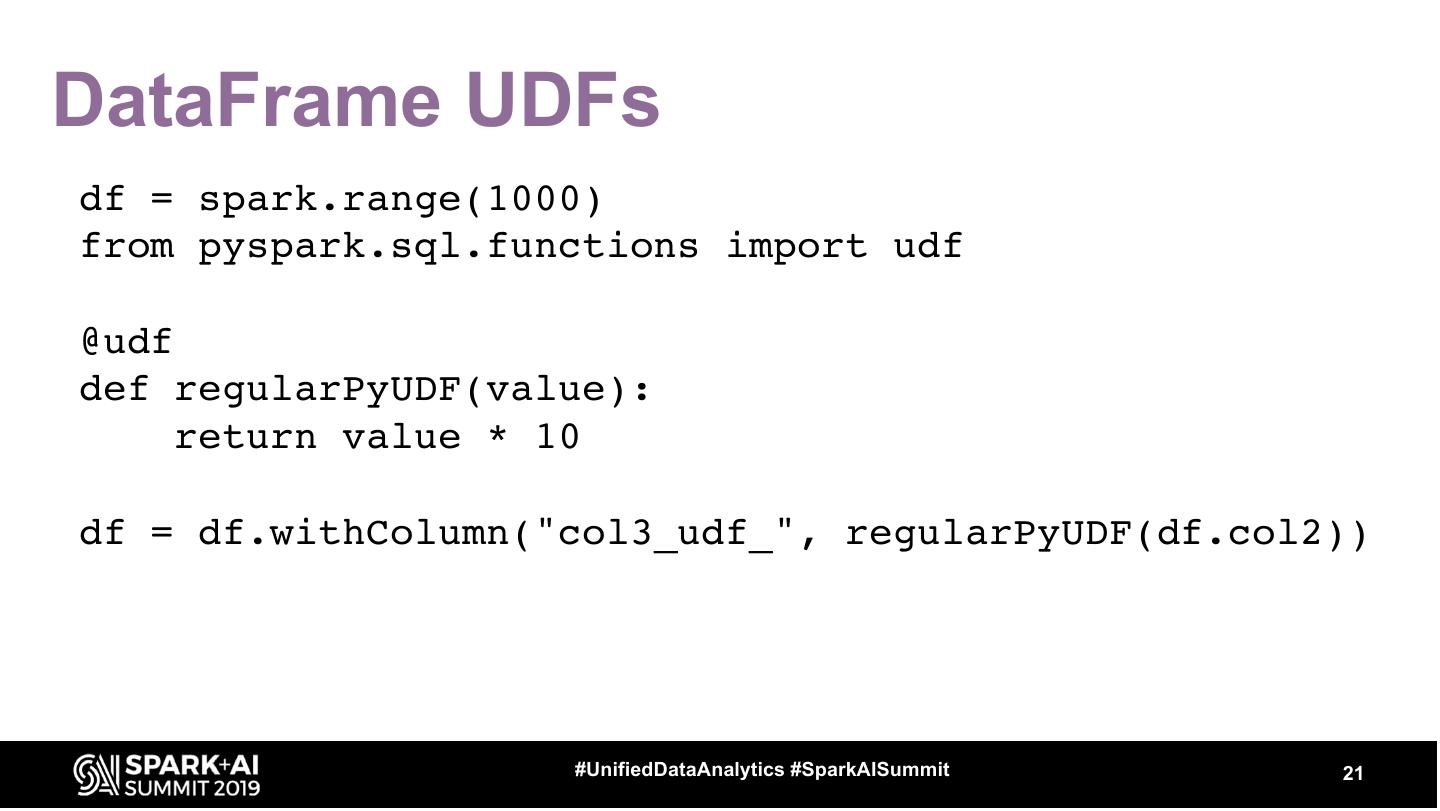 21 .DataFrame UDFs df = spark.range(1000) from pyspark.sql.functions import udf @udf def regularPyUDF(value): return value * 10 df = df.withColumn("col3_udf_", regularPyUDF(df.col2)) #UnifiedDataAnalytics #SparkAISummit 21