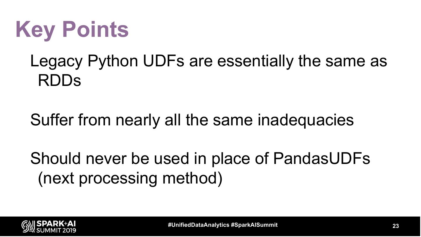 23 .Key Points Legacy Python UDFs are essentially the same as RDDs Suffer from nearly all the same inadequacies Should never be used in place of PandasUDFs (next processing method) #UnifiedDataAnalytics #SparkAISummit 23