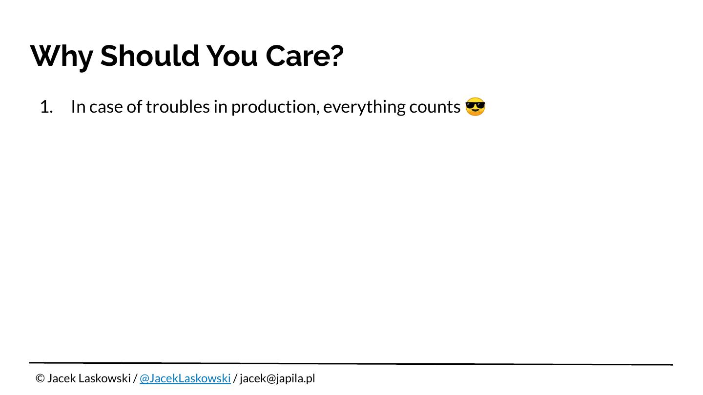 4 .Why Should You Care? 1. In case of troubles in production, everything counts 😎 © Jacek Laskowski / @JacekLaskowski / jacek@japila.pl