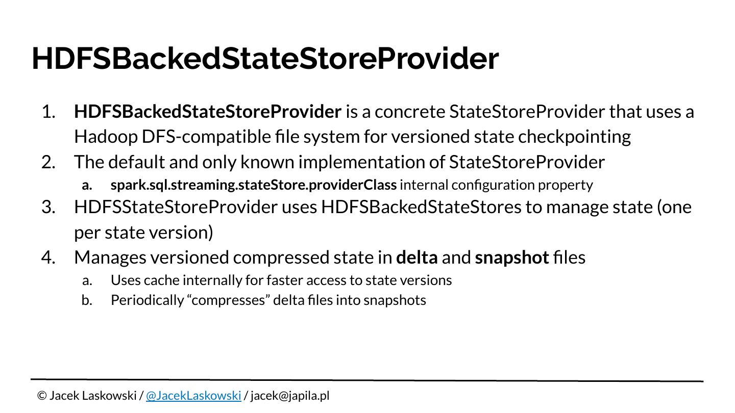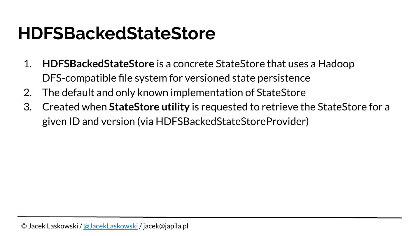 7 .HDFSBackedStateStore 1. HDFSBackedStateStore is a concrete StateStore that uses a Hadoop DFS-compatible file system for versioned state persistence 2. The default and only known implementation of StateStore 3. Created when StateStore utility is requested to retrieve the StateStore for a given ID and version (via HDFSBackedStateStoreProvider) © Jacek Laskowski / @JacekLaskowski / jacek@japila.pl