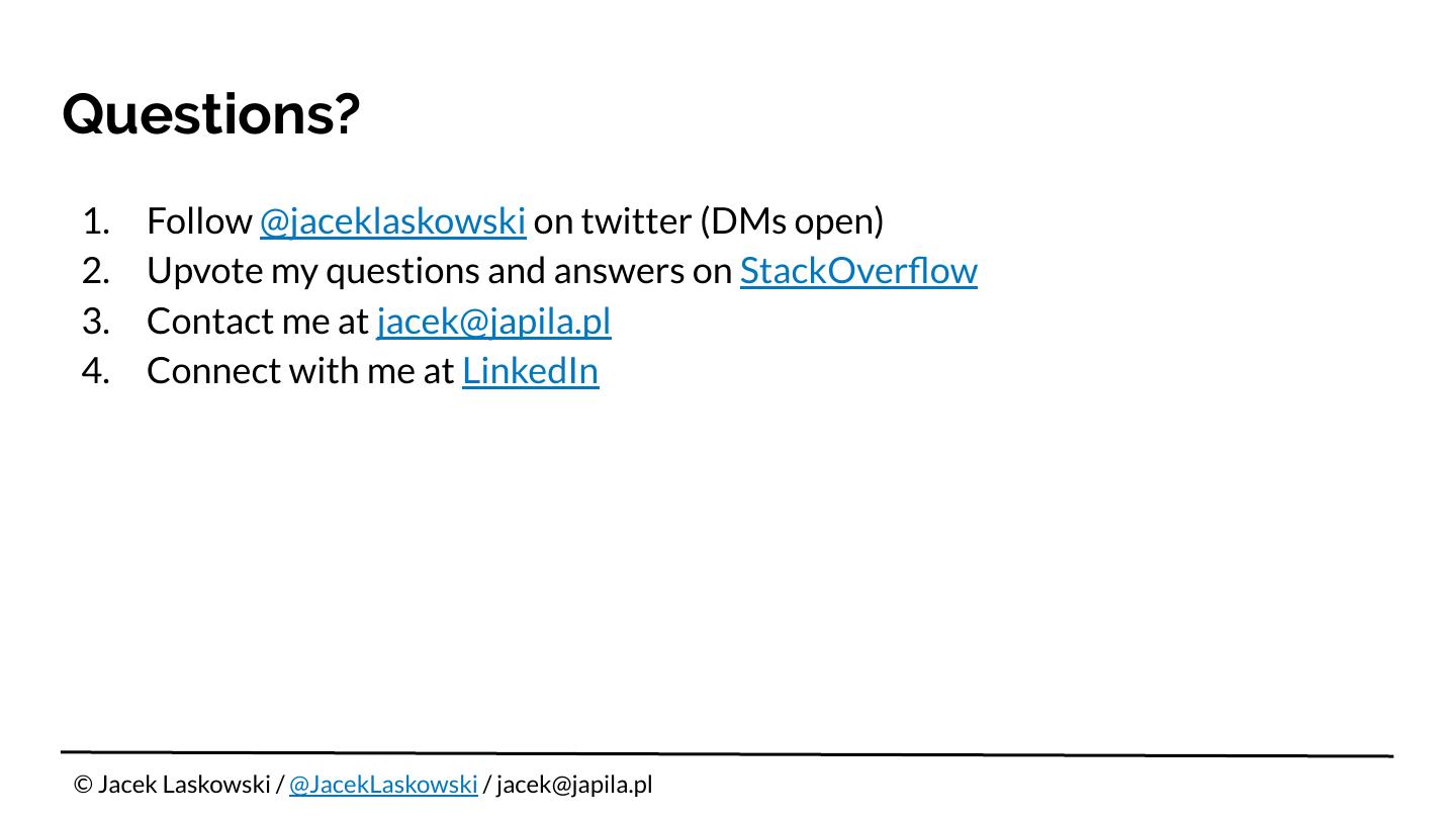 17 .Questions? 1. Follow @jaceklaskowski on twitter (DMs open) 2. Upvote my questions and answers on StackOverflow 3. Contact me at jacek@japila.pl 4. Connect with me at LinkedIn © Jacek Laskowski / @JacekLaskowski / jacek@japila.pl