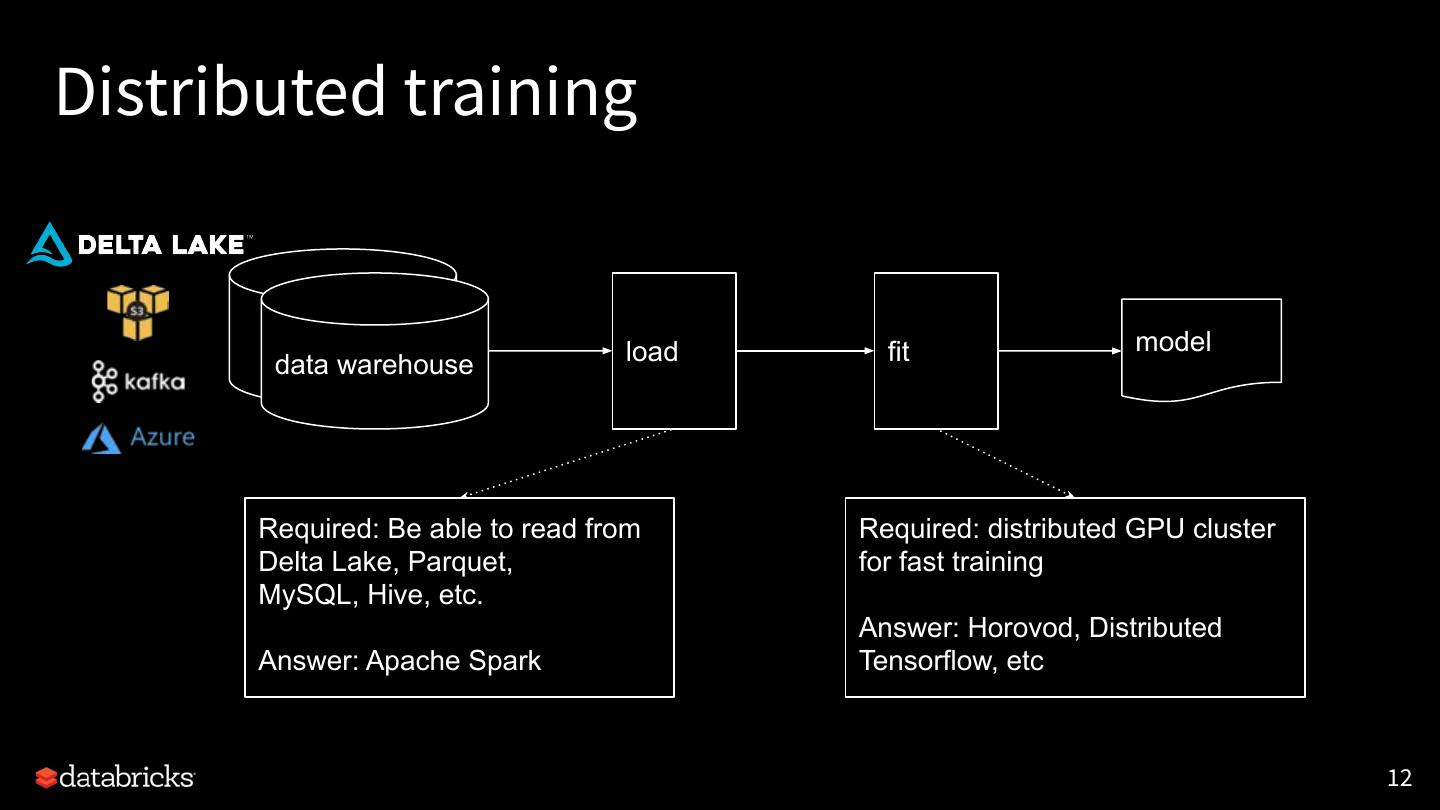 12 .Distributed training load fit model data warehouse Required: Be able to read from Required: distributed GPU cluster Delta Lake, Parquet, for fast training MySQL, Hive, etc. Answer: Horovod, Distributed Answer: Apache Spark Tensorflow, etc 12