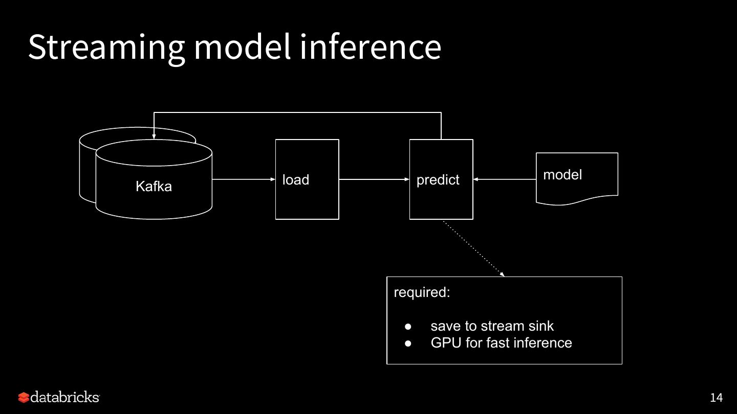 14 .Streaming model inference load predict model Kafka required: ● save to stream sink ● GPU for fast inference 14