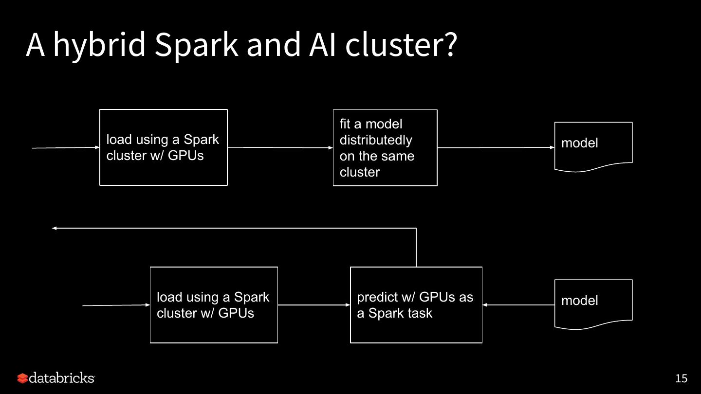 15 .A hybrid Spark and AI cluster? fit a model load using a Spark distributedly model cluster w/ GPUs on the same cluster load using a Spark predict w/ GPUs as model cluster w/ GPUs a Spark task 15
