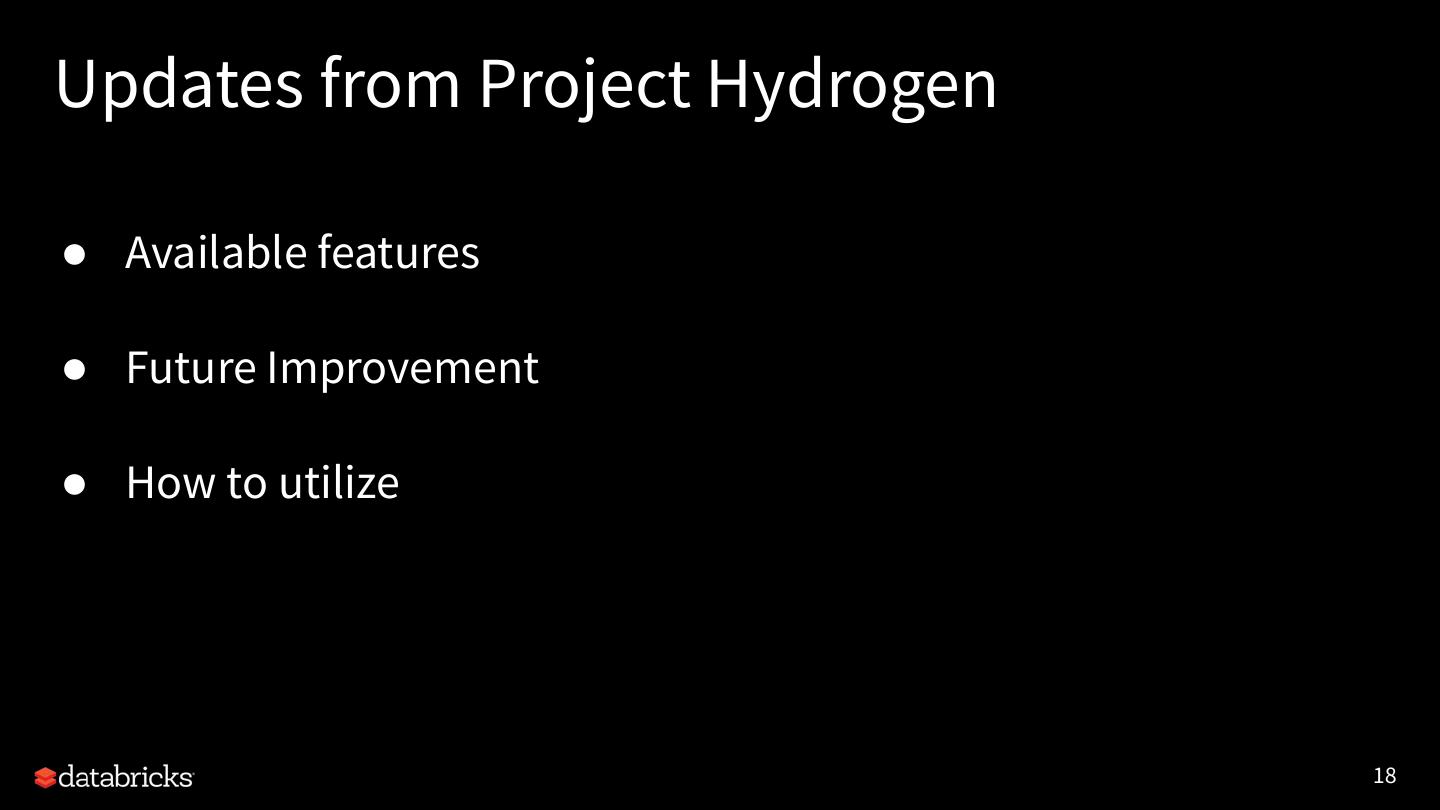 Updates from Project Hydrogen: Unifying State-of-the-Art AI and Big Data in Apache Spark Project Hydrogen is a major Apache Spark initiative to bring state-of-the-art AI and Big Data solutions together.