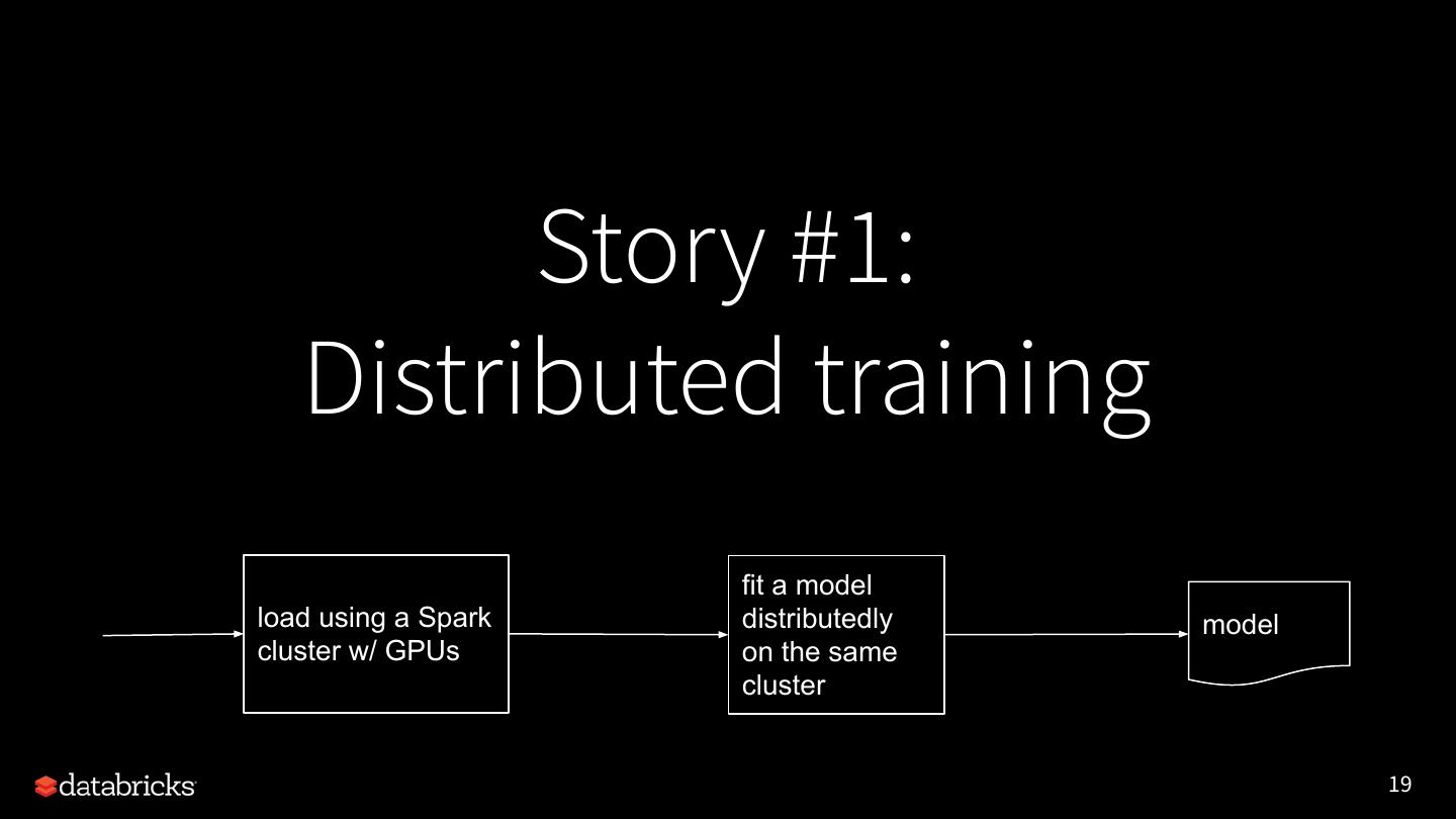 19 . Story #1: Distributed training fit a model load using a Spark distributedly model cluster w/ GPUs on the same cluster 19