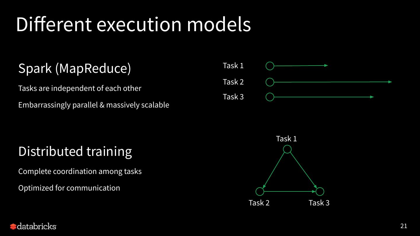 21 .Different execution models Task 1 Spark (MapReduce) Task 2 Tasks are independent of each other Task 3 Embarrassingly parallel & massively scalable Task 1 Distributed training Complete coordination among tasks Optimized for communication Task 2 Task 3 21
