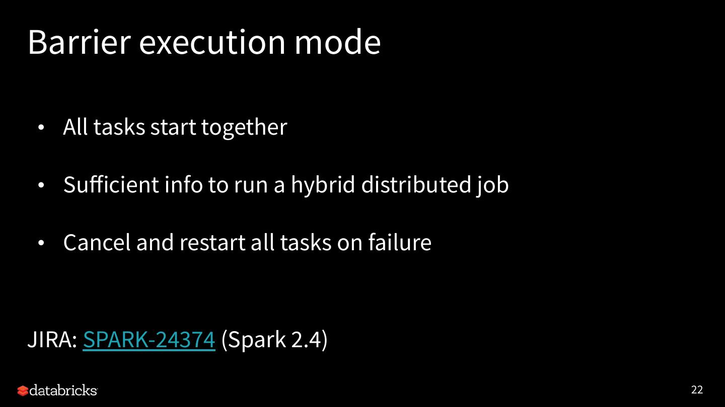 22 .Barrier execution mode • All tasks start together • Sufficient info to run a hybrid distributed job • Cancel and restart all tasks on failure JIRA: SPARK-24374 (Spark 2.4) 22